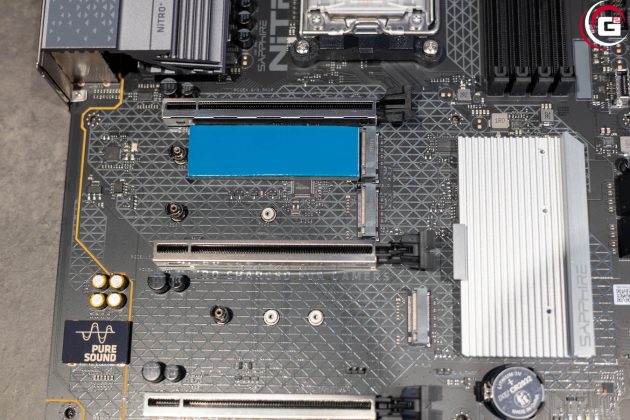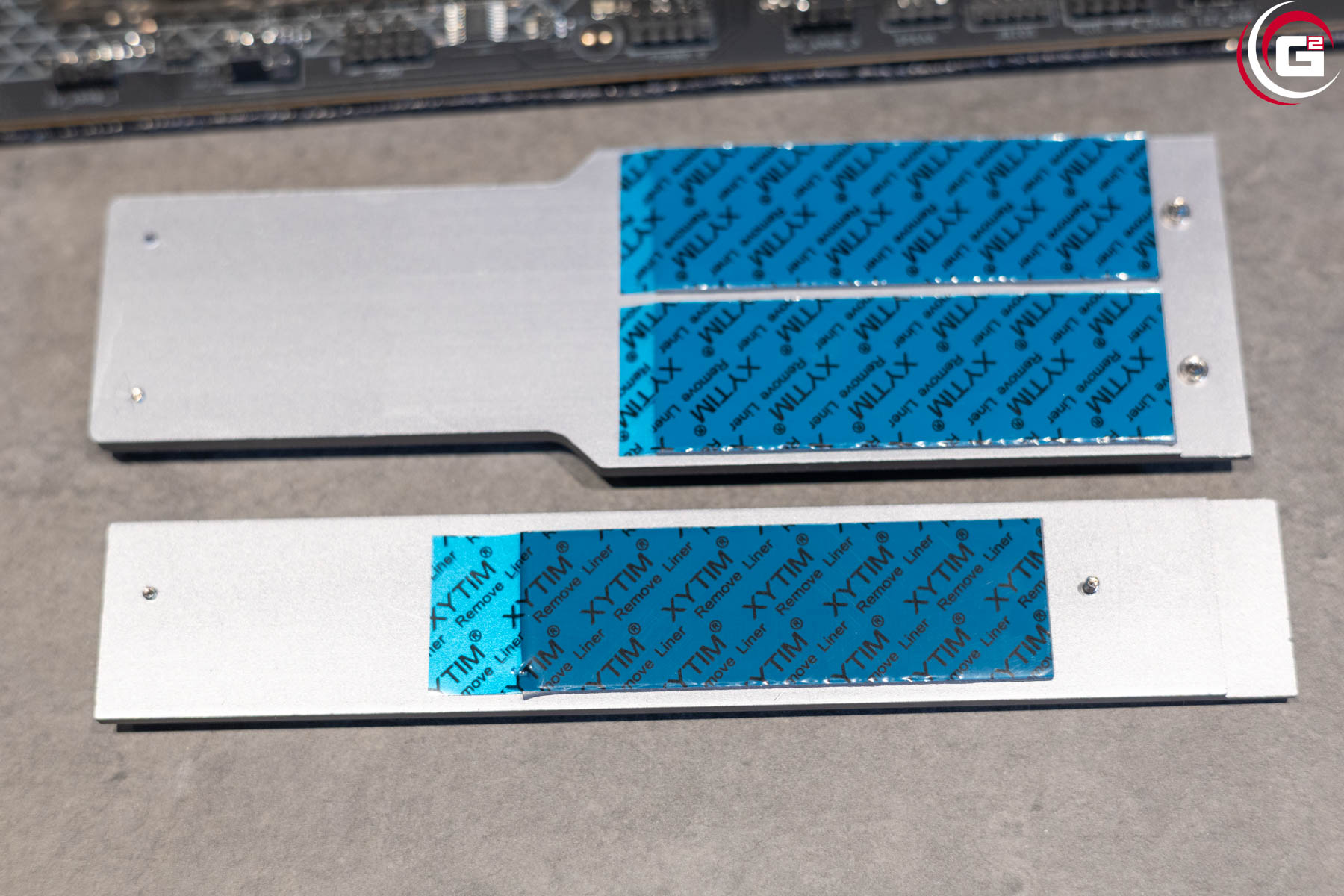 Angeordnet sind die NVMe-SSD-Slots zwischen den Erweiterungssteckplätzen. Jeder Steckplatz verfügt über einen Kühlkörper samt Wärmeleitpad.
