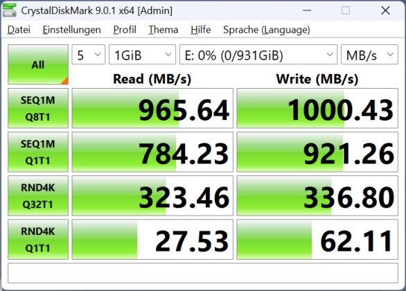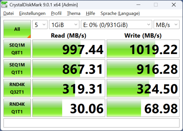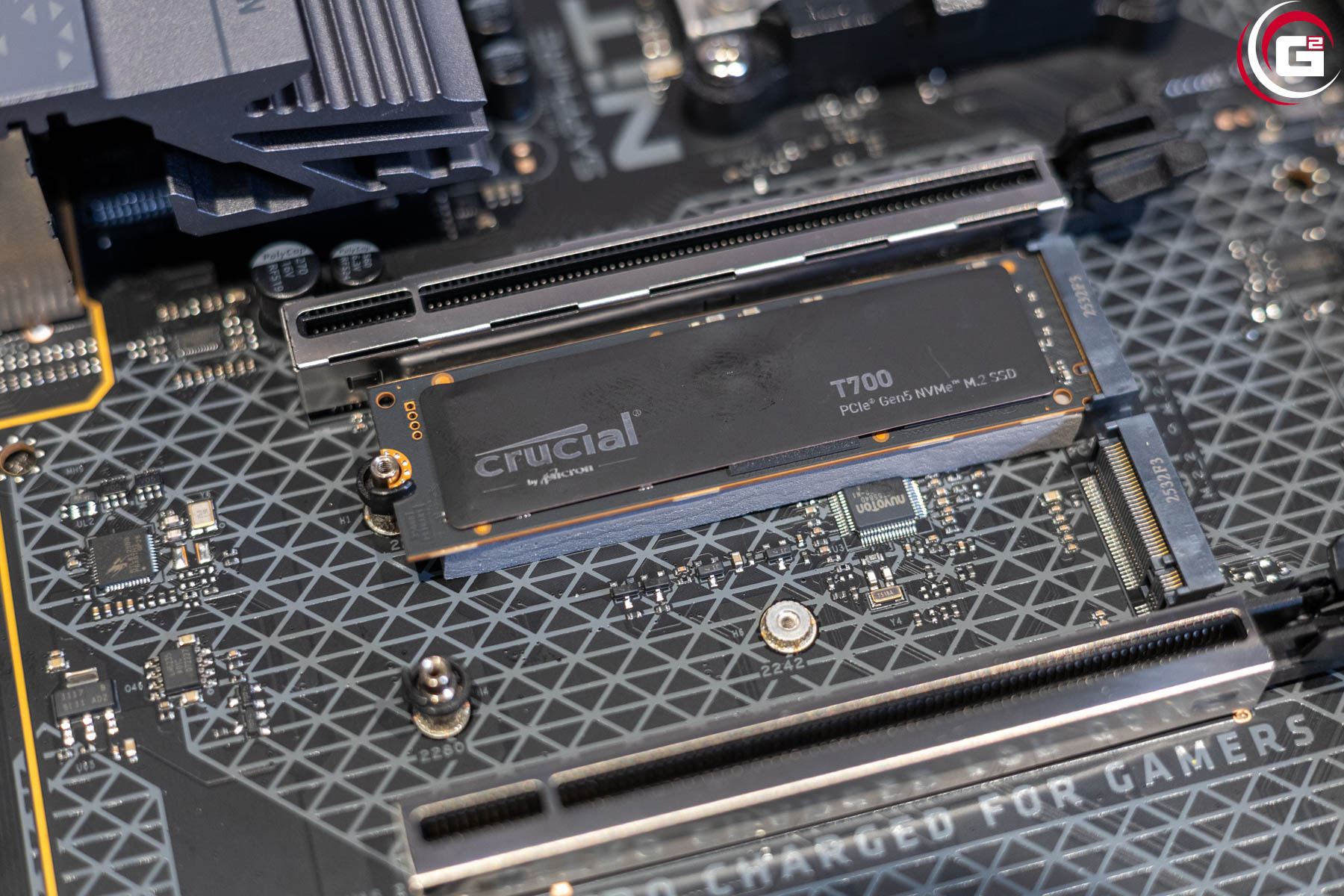 Getestet haben wir die Performance der an die CPU angebundene M.2-Schnittstelle M2_1 mit einer Crucial T700 mit einer Kapazität von 2 TB. Hier zeigen die Datenraten die zu erwartende Performance.