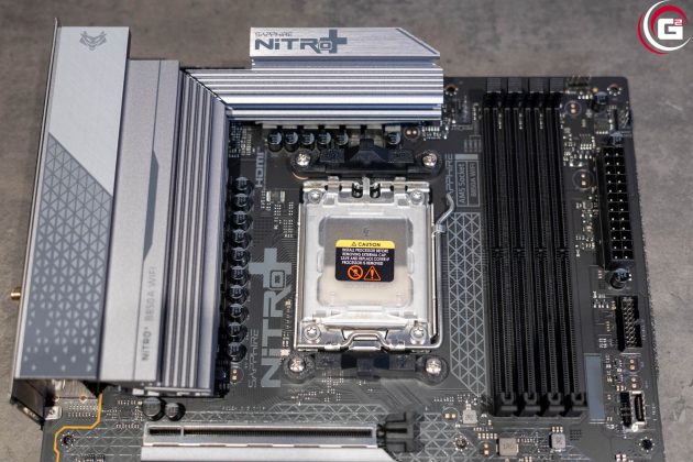 Das SAPPHIRE NITRO+ B850A WIFI 7 unterstützt alle bislang für den AM5-Sockel erschienenen AMD-Ryzen-CPUs. Anders als der AM4-Sockel ist der AM5-Sockel ein LGA-Sockel, das heißt, die Pins sind auf dem Mainboard. Der Sockel ist so aufgebaut, dass die Pins ohne montierte CPU durch einen Kunststoffrahmen geschützt werden. Dennoch muss man auch hier bei der Montage vorsichtig sein. Verfügbar für den AM5-Sockel sind die CPUs mit der Zen-4- und Zen-5-Mikroarchitektur und somit die 7000er-, 8000er- und 9000er-Serie. Für die Stromversorgung der CPU stehen 12+2+1.Phasen zur Verfügung. Für die CPU werden zwei 8-Pin-EPS-Stecker benötigt. Die Kühlung der VRM erfolgt über einen großen Kühlkörper mit hochleitfähigen Wärmeleitpads.
