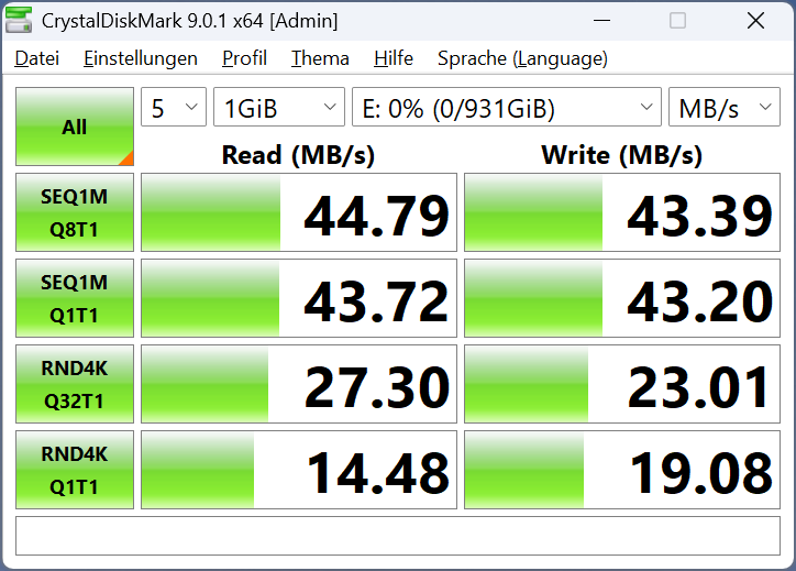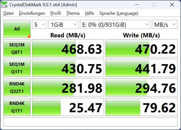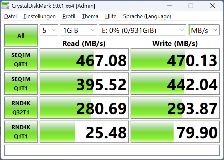 Für einen Test der USB-Schnittstellen haben wir eine externe SSDs genutzt, die SanDisk Extreme PRO Portable SSD. Mit dieser haben wir die rückseitigen USB-3.2-Gen2-Typ-A, USB-3.2-Gen2-Typ-C- und USB-2.0-Schnittstellen sowie die an der Front platzierten USB-3.2-Gen1-Typ A bzw. C Schnittstellen getestet.