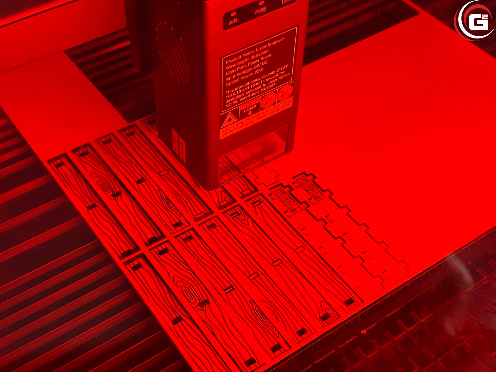 Um die passgenaue Fertigung besser zu prüfen, haben wir Sperrholz so graviert und geschnitten, dass man hieraus eine Palette aufbauen kann, die als Getränkeuntersetzer dient. Auch hier sind wir schnell und präzise um Ziel gekommen. Damit uns beim Ausschneiden der schmalen Elemente keine Teile in die Schublade fallen, haben wir diese in Lightburn so ausgerichtet, dass sie senkrecht zu den Auflagen ausgerichtet sind. Darüber hinaus haben wir im Arbeitsbereich die Auflagestangen auf den minimalen Abstand gebracht.