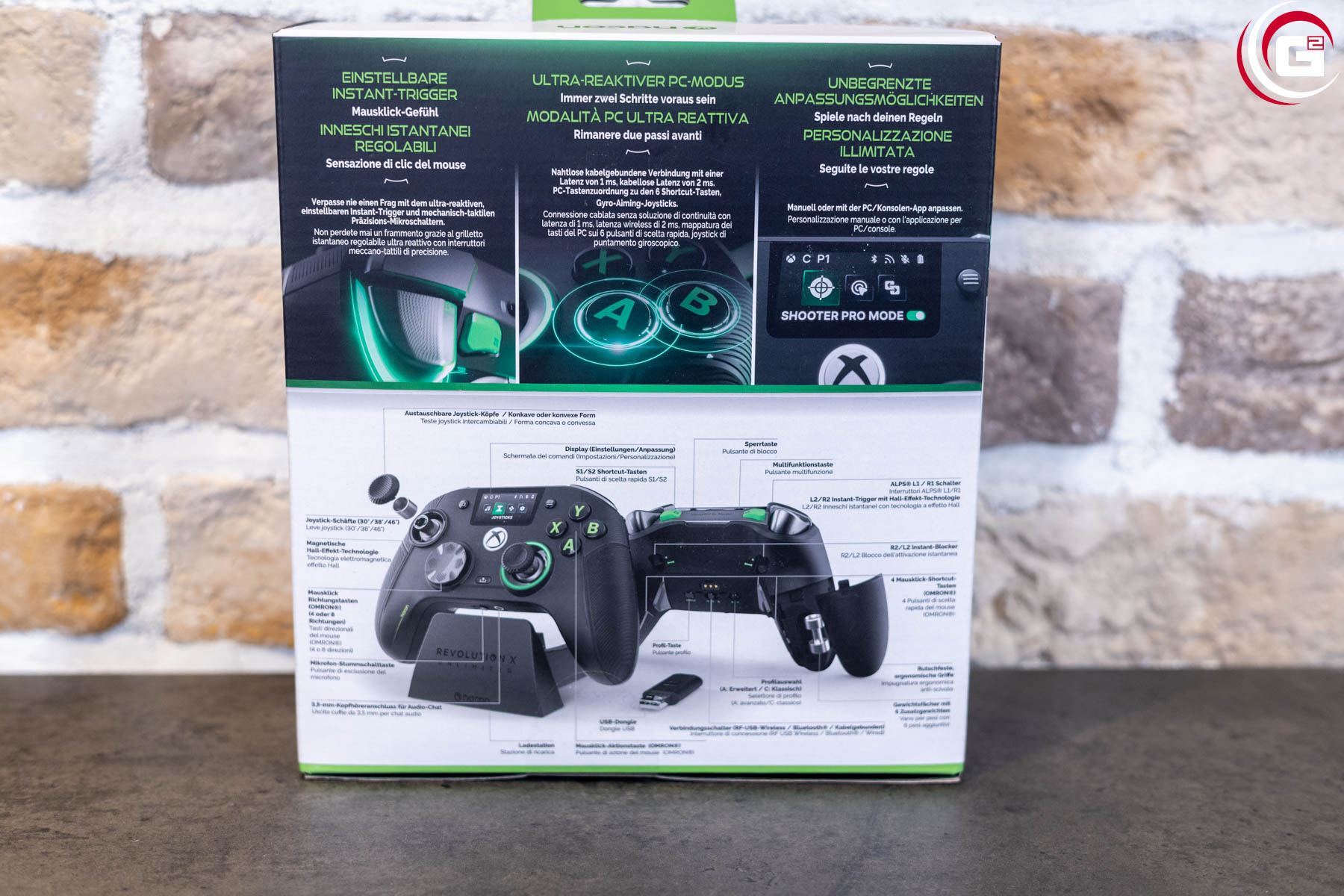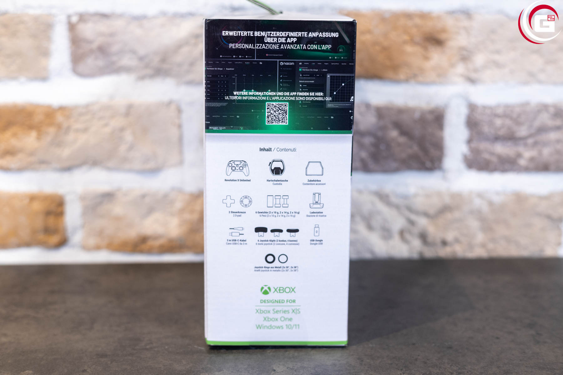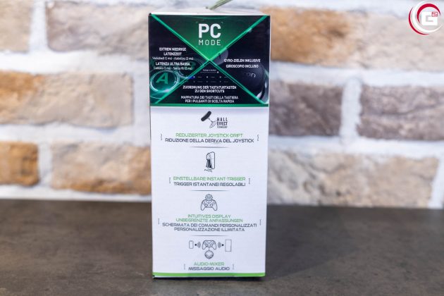 Typisch für NACON dominiert weiß die Umverpackung des Revolution X Unlimited. An den grünen Akzenten erkennt man hier aber sehr gut, dass es sich um ein Produkt mit Xbox-Kompatibilität handelt. Die Vorderseite zeigt eine Abbildung des Controllers und ein paar Hinweise auf die Konnektivität. Auf der linken/rechten Seite und der Rückseite finden sich einige weitere technische Details, sowie weitere Abbildungen.