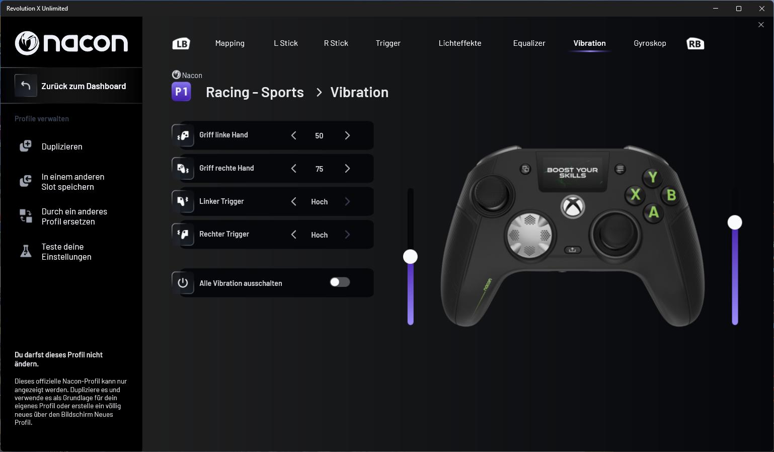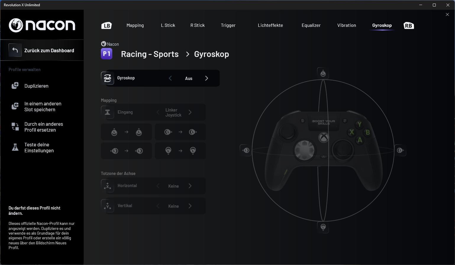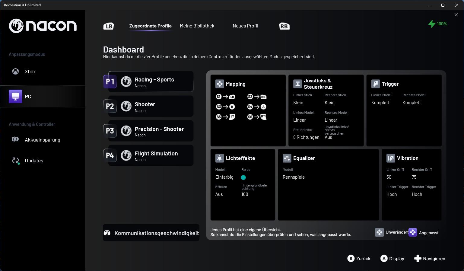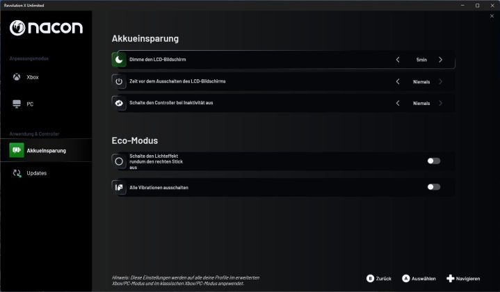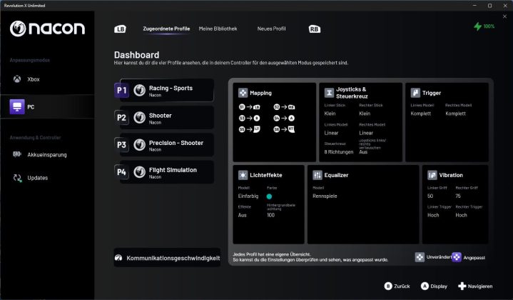 Wer mehr Kontrolle möchte, findet in der Revolution-X-Unlimited-App (abrufbar über den Microsoft Store) umfangreiche Anpassungsmöglichkeiten. Hier können Tasten neu belegt, Stick-Kurven definiert und Trigger-Deadzones präzise eingestellt werden. Zudem lassen sich bis zu vier Profile pro Plattform speichern und direkt am Controller abrufen. Besonders interessant, wenn man häufig zwischen Genres oder Spielen wechselt. Dank der Optionen zum Finetuning ist eine noch individuellere Anpassung des Controllers möglich.