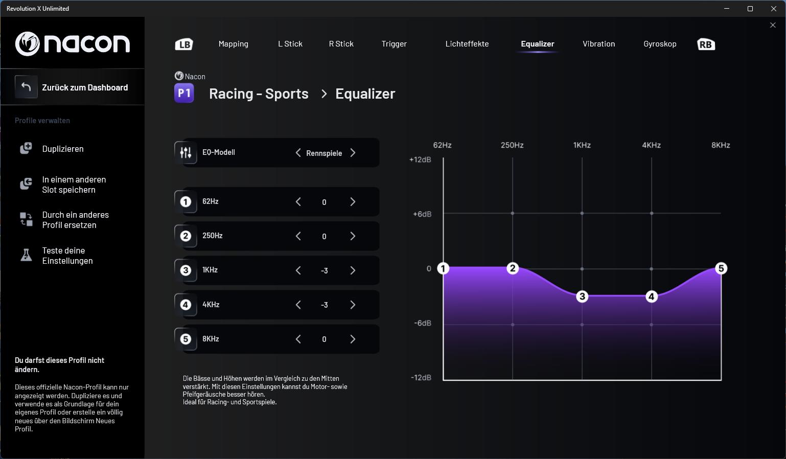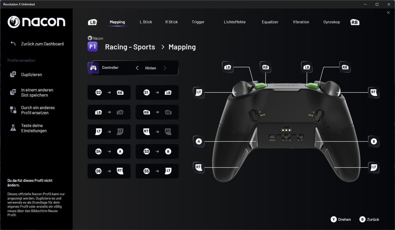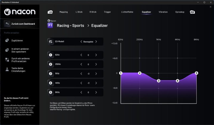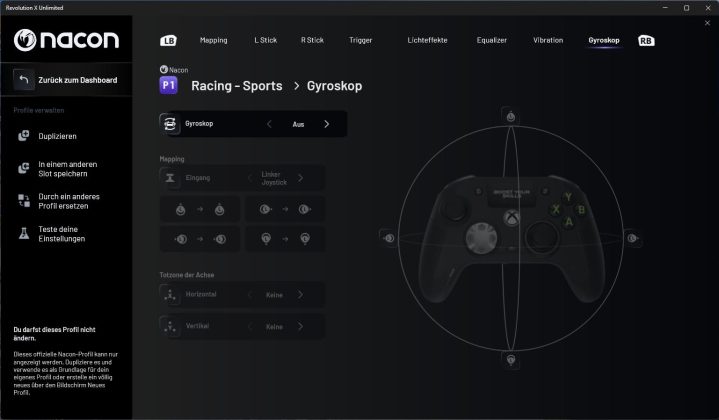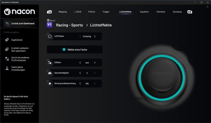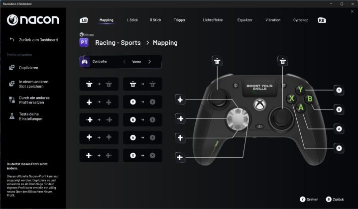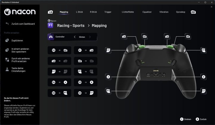 Auf der Übersichtsseite kann man sich zunächst die hinterlegten Profile und deren Mapping anzeigen lassen. Wenn man ein Profil anklickt, kommt man in die Anpassungen und kann hier Vorder- und Rückseite einzeln konfigurieren. Die Profile P1 bis P4 sind von NACON vorkonfiguriert und können nicht verändert werden. Man kann sich aber eine Kopie erzeugen und diese individuell anpassen. Auf weiteren Seiten kann man dann noch die Beleuchtungseffekte (statisch, dynamisch, …), das Gyroskop sowie die Audio- und Vibrationskonfiguration anpassen. Auch für grundlegende Einstellungen, wie die Energiesparoptionen, gibt es ein eigenes Menü.