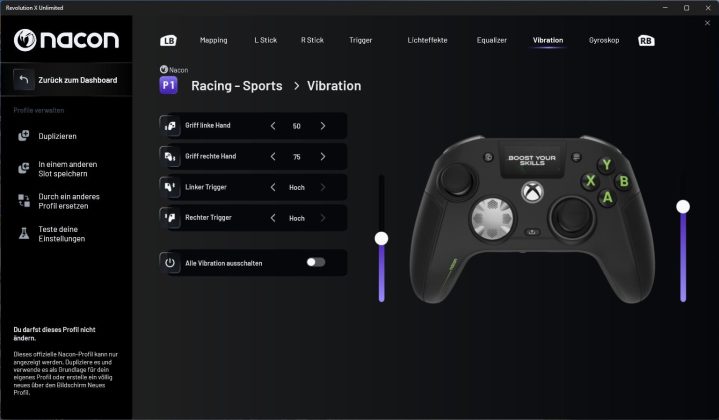 Im Controller sind vier Vibrationsmotoren integriert, zwei in den Griffen und zwei in den Triggern. Diese sorgen für ein fein abgestimmtes haptisches Feedback, das sich in der Software in Intensität und Verhalten anpassen lässt.