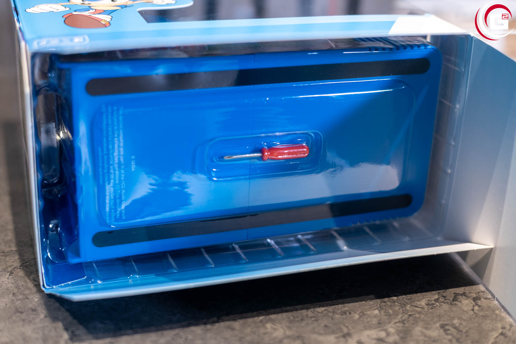 Geliefert wird der My Arcade Sonic the Hedgehog Joystick Player in einer großformatigen Blisterverpackung. Diese lässt einen direkten Blick auf das Produkt im Inneren zu und ist mit diversen Sonic-Prints geschmückt. Auf der Rückseite fidnetn sich noch einige Infos zu den Funktionen, Features und installierten Spielen, dazu kann man die Rückseite aufklappen. Zum Lieferumfang gehören neben dem Joystick Player selbst ein Mini-Schraubendreher sowie eine Bedienungsanleitung. Ein USB-Kabel oder Batterien werden nicht mitgeliefert.
