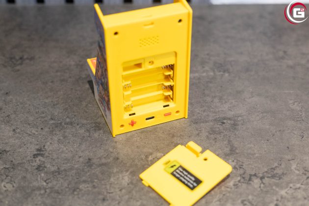 Das Gerät verfügt über ein integriertes 2,4-Zoll-Farbdisplay mit hoher Auflösung, auf dem die Spiele direkt dargestellt werden. Für die Audioausgabe ist ein rückseitig platzierter Lautsprecher verbaut, dessen Lautstärke reguliert werden kann. Die Stromversorgung erfolgt wahlweise über vier AAA-Batterien oder über ein USB-C-Kabel, wobei beides nicht im Lieferumfang enthalten ist. Mit Abmessungen von etwa 75 × 86 × 121 mm und einem Gewicht von rund 159 Gramm ist das Gerät kompakt gehalten und orientiert sich optisch an einem klassischen Arcade-Automaten im Mini-Format.