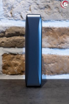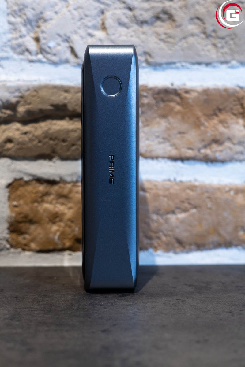 Passend zur Prime-Serie besitzt die Anker Prime Powerbank (26K, 300W) ein insgesamt edles und hochwertiges Auftreten. Der Rahmen des Gehäuses und die Rückseite besteht aus Aluminium mit einem eher dunklen Oberflächenfinish. Die Vorderseite ist in schwarzem, glänzenden Acryl gehalten, so passt sich die Optik einem Smartphone oder Tablet an. Die hohe Kapazität erfordert natürlich mehrere Zellen im Inneren, sodass die Powerbank kein Leichtgewicht ist. Das Display ist nahtlos in die Optik der Vorderseite integriert und seitlich findet sich der Ein-/Ausschalter.