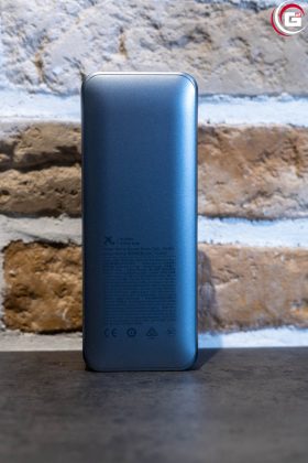 Alle Anschlüsse sind an der Oberseite platziert. Der USB-A-Anschluss ist ein Ausgang, beide USB-C-Anschlüsse sind Ein-/Ausgänge. An der Unterseite finden sich zudem noch die Ladekontakte für die Ladestation. Das mitgelieferte USB-C-Kabel ist vollständig mit Nylon ummantelt und besitzt eine gute Festtigkeit. Eine gute Ergänzung ist auch der passgenaue Schutzbeutel für die Powerbank, dieser kann auch das Ladekabel mit aufnehmen.