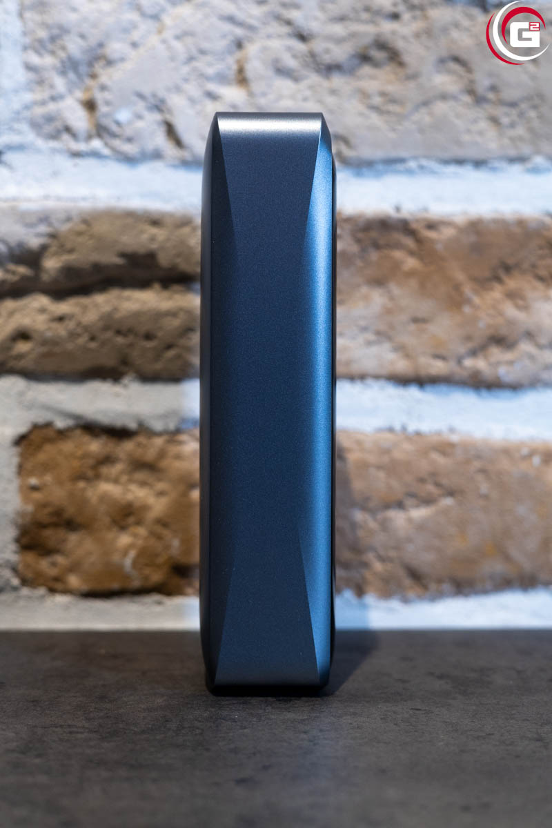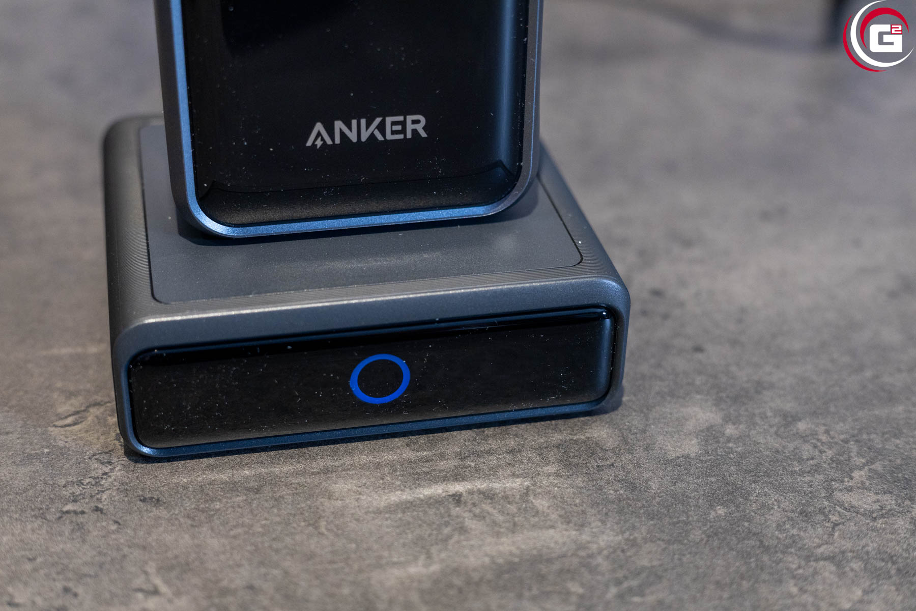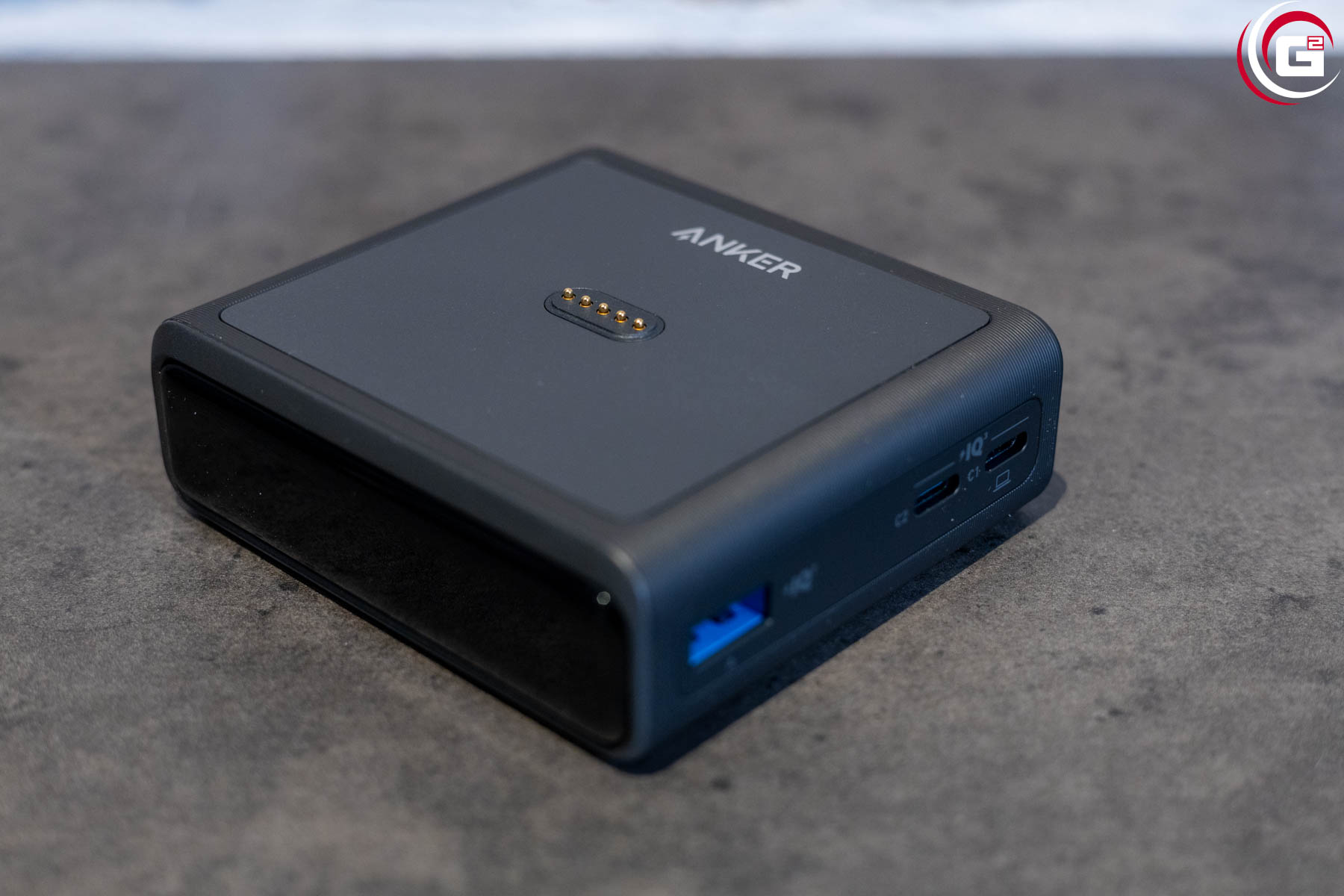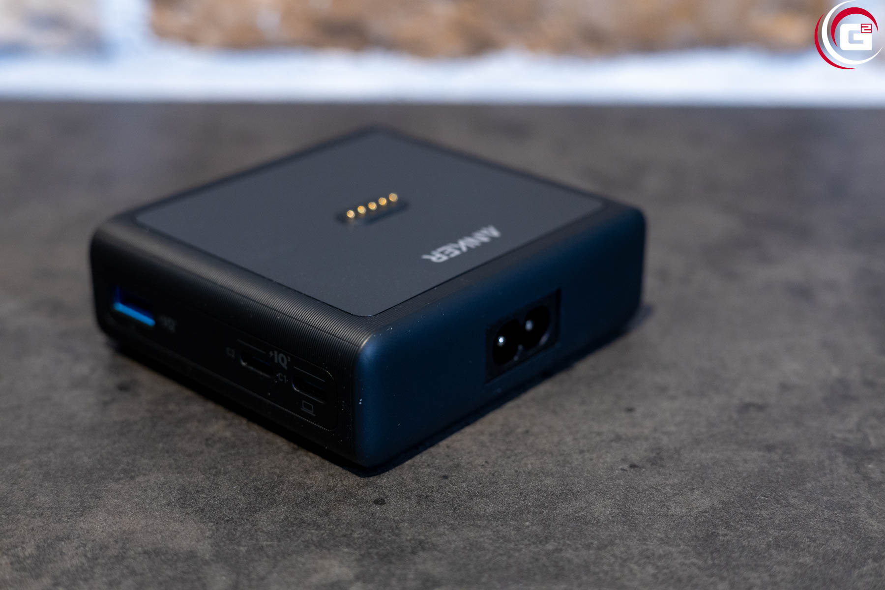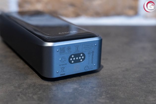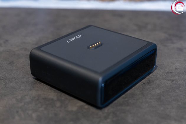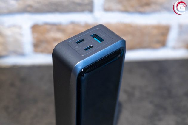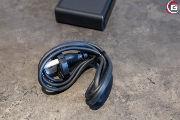 Die 100 W Ladestation besitzt ein kompaktes, flaches Gehäuse. Auf der Oberseite finden sich die Kontakte für die Powerbank, die magnetisch fixiert wird. Das Gehäuse besteht aus anthrazit farbenem Kunststoff und die Vorderseite ist passend zur Powerbank ebenfalls in schwarzem, glänzenden Acryl gehalten. Der Stromanschluss findet sich an der Rückseite, an der rechten Seite sind noch ein USB-A- und zwei USB-C-Ladeanschlüsse untergebracht.