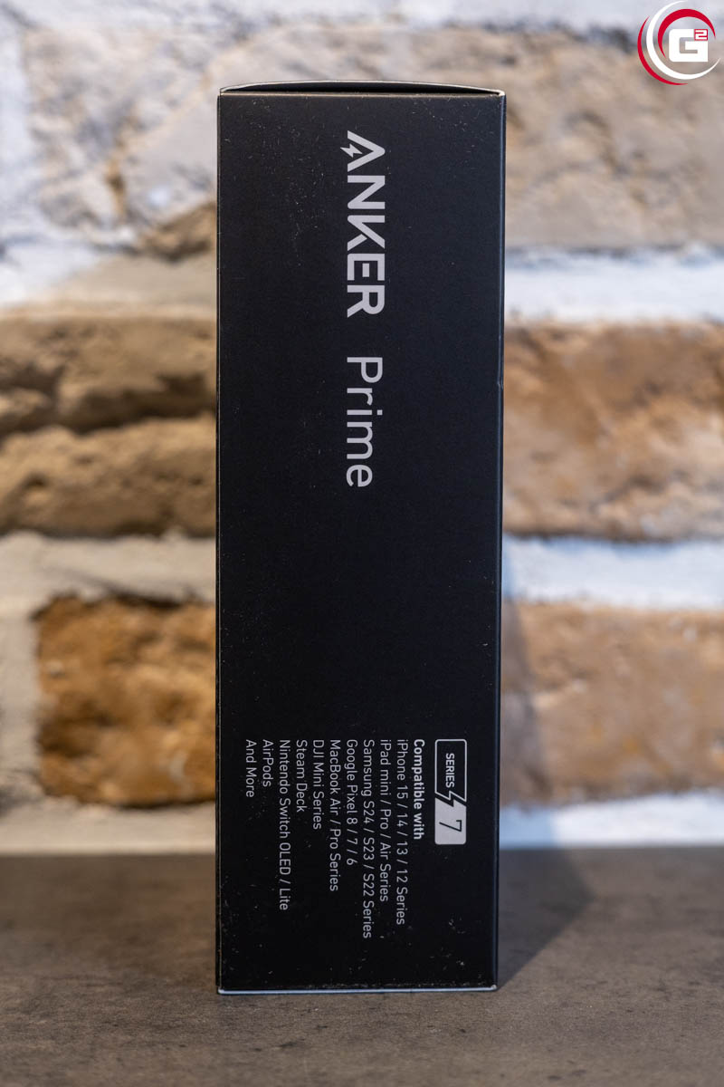 Die Umverpackung der Anker Prime Powerbank (26K, 300W) ist modern gestaltet und präsentiert die Powerbank im Stil von Anker Prime vor einem dunklen Hintergrund. Auf der Vorderseite findet sich eine Produktabbildung mit einigen technischen Highlights, weitere Details werden auf der Rückseite aufgelistet. Drei zentrale Features werden unten auf der Vorderseite besonder prominent hervorgehoben.