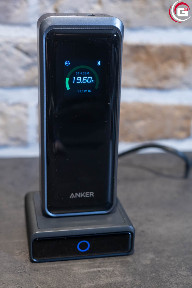 Zum Laden der Powerbank hat sich die 100 W Ladestation als ideale Lösung präsentiert. Einfach die Powerbank auf die Ladestation stellen und schon geht es los. Die angegebene Ladeleistung von 100 W wir erreicht und die Powerbank ist in unter 2 Stunden vollständig geladen. Mit der kombinierten 250-W-Ladung ginge es zwar noch schneller, aber so ist der Ladevorgang auch schonender. Das integrierte Display zeigt Ladestand, Ladeleistung und die verbleibende Zeit an, die Ladestation zeigt einen aktiven Ladevorgang über einen Ring auf der Vorderseite an.