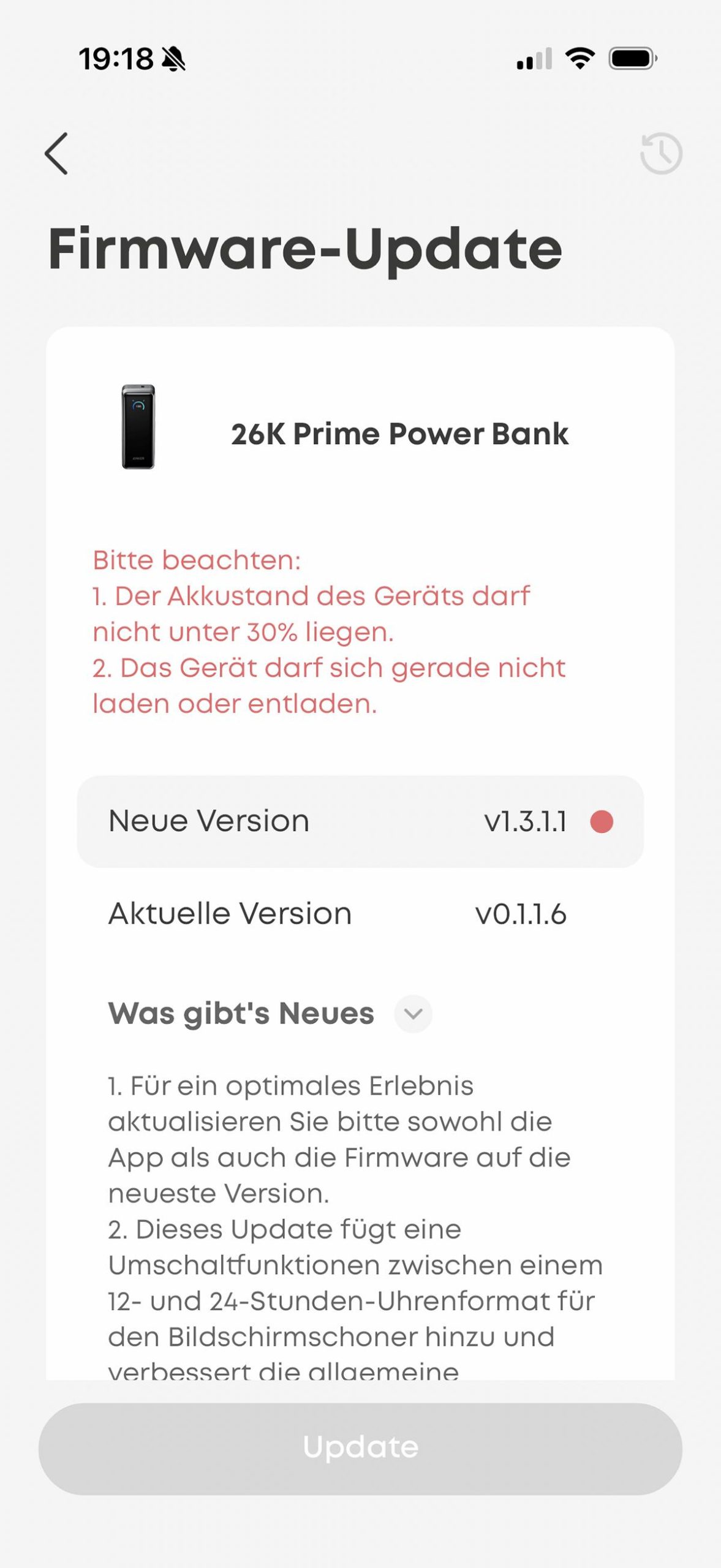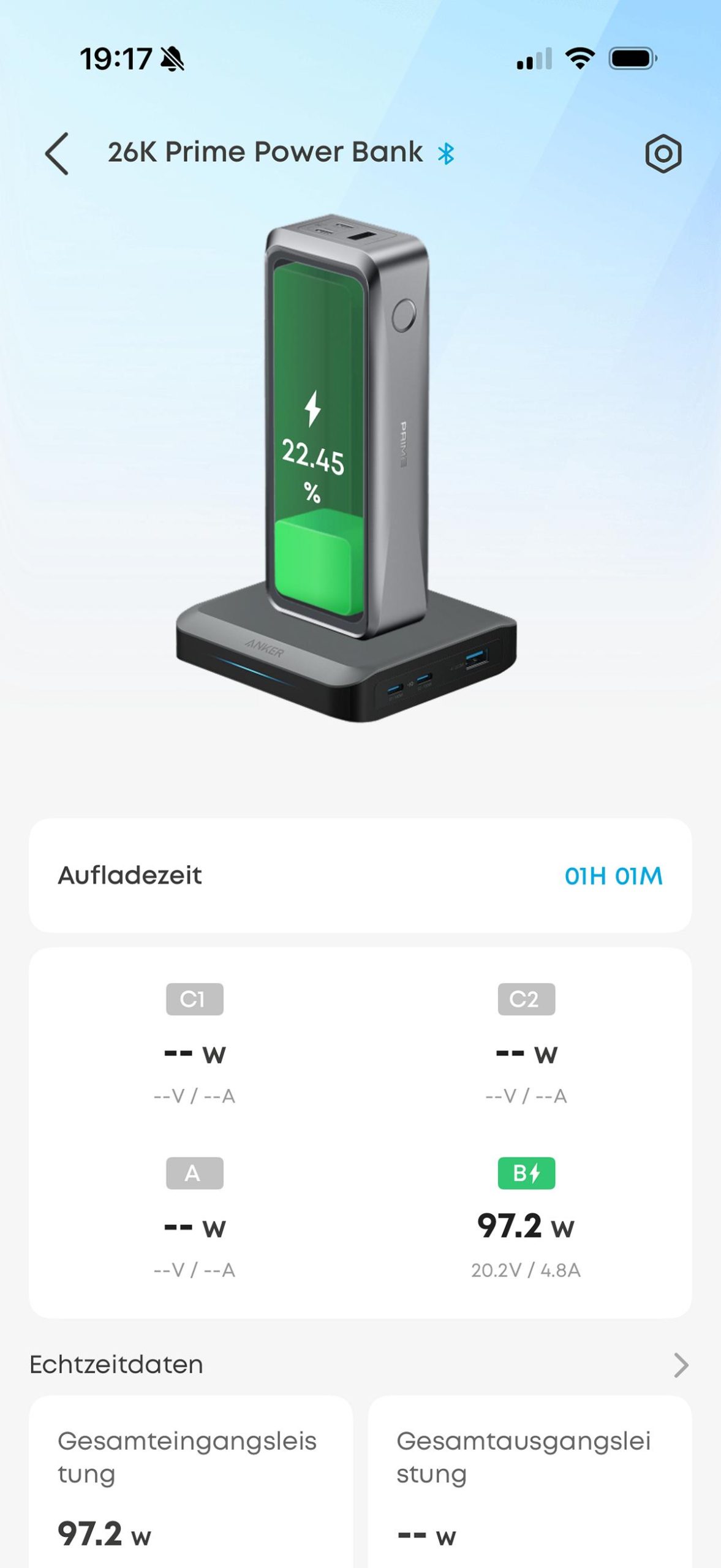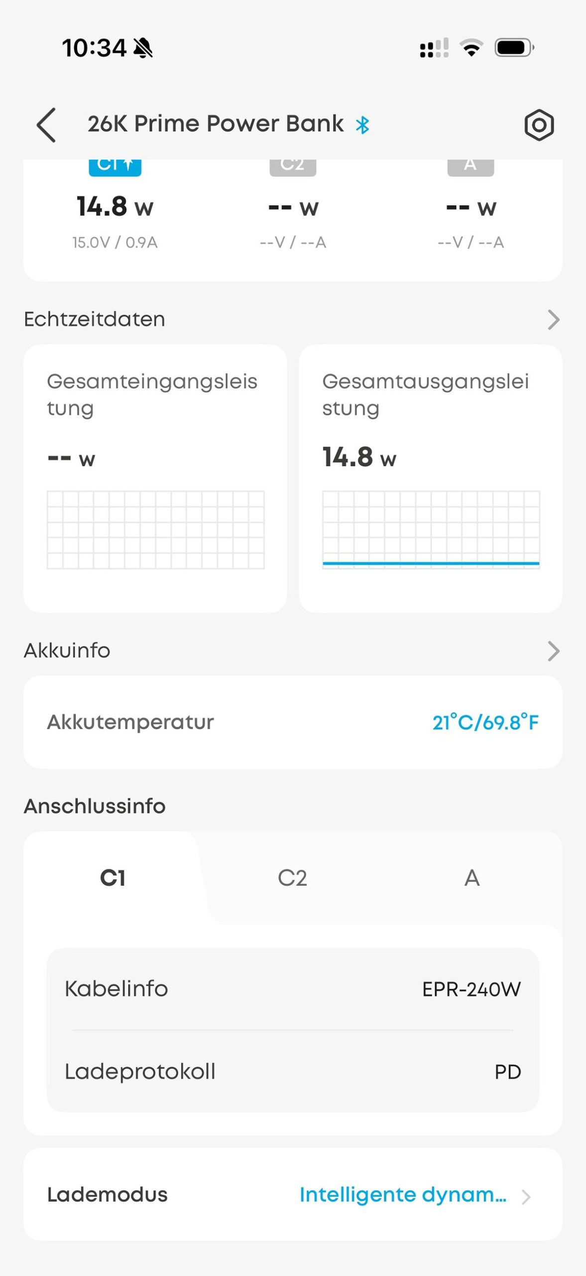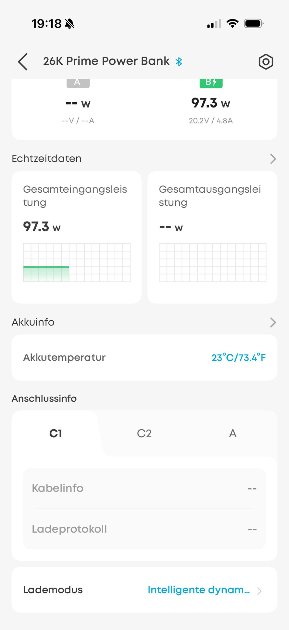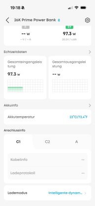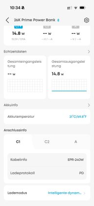 Über die App lässt sich die Firmware der Powerbank aktualisieren. Zudem ist es möglich die Echtzeitleistungsdaten (inklusive Spannung und Strom) aller Ein-/Ausgänge zu überwachen. Man kann hier auch anpassen, ob alle Anschlüsse ihre Leistung automatisch zugeteilt bekommen oder auch eine manuelle Anpassung vornehmen. Bei der Verwendung von USB-C-Kabeln wird auch eine Info zur maximal möglichen Ladeleistung des Kabels angezeigt, sehr praktisch um hier einen möglichen Flaschenhals zu erkennen.