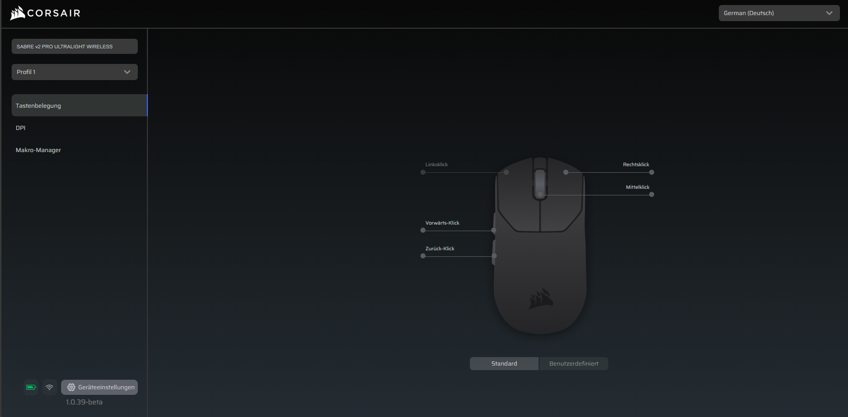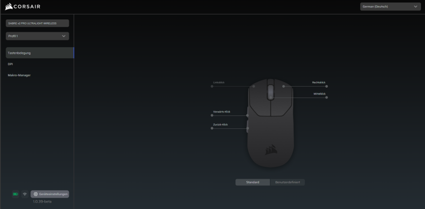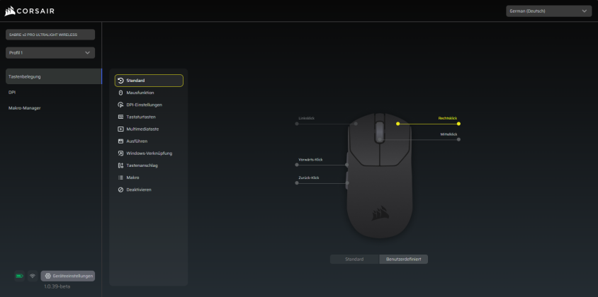 Es gibt drei hauptsächliche Tabs für die Anpassung der Maus. Der erste ist für die Tastenbelegung gedacht. Hier kann man einmal das Standard-Profil wählen oder benutzerdefinierte Anpassungen vornehmen. So kann man den Rechts- und Mittelklick sowie beide Zusatztasten individuell belegen. Egal ob Mausfunktion, Multimediatasten oder Makro, hier ist viel Freiheit gegeben.