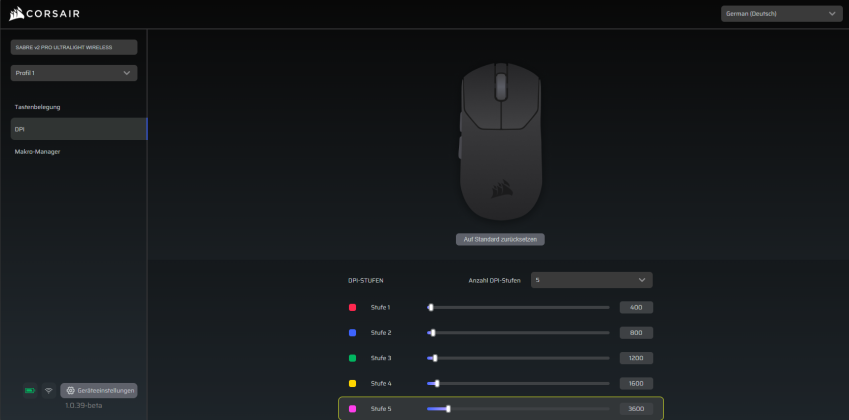 Die Konfiguration der CORSAIR SABRE v2 PRO Ultralight Wireless Gaming erfolgt nicht über CORSAIR iCUE, sondern über den ebenso schlanken CORSAIR WEB HUB. Ähnlich wie VIA bei Tastaturen arbeitet dieses Tool webbasiert und benötigte so kaum nennenswerte Systemressourcen. Da die Maus bei ihrer Ausstattung auch auf das wesentliche reduziert ist, sind die Konfigurationsmöglichkeiten übersichtlich gehalten.