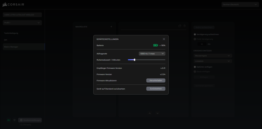Zudem gibt es noch ein Einstellungsmenü. Hier kann man die Polling-Rate und die Ausschaltzeit einstellen sowie ein mögliches Firmware-Update herunterladen.