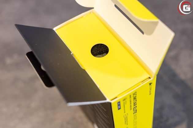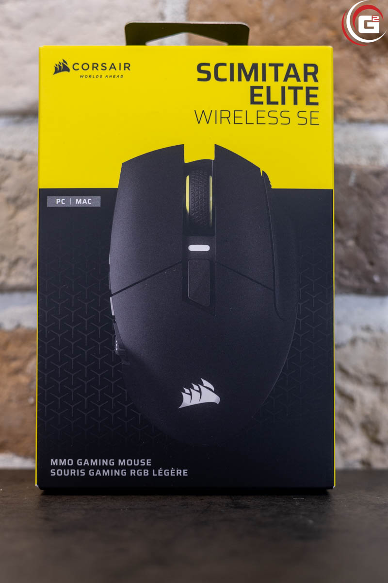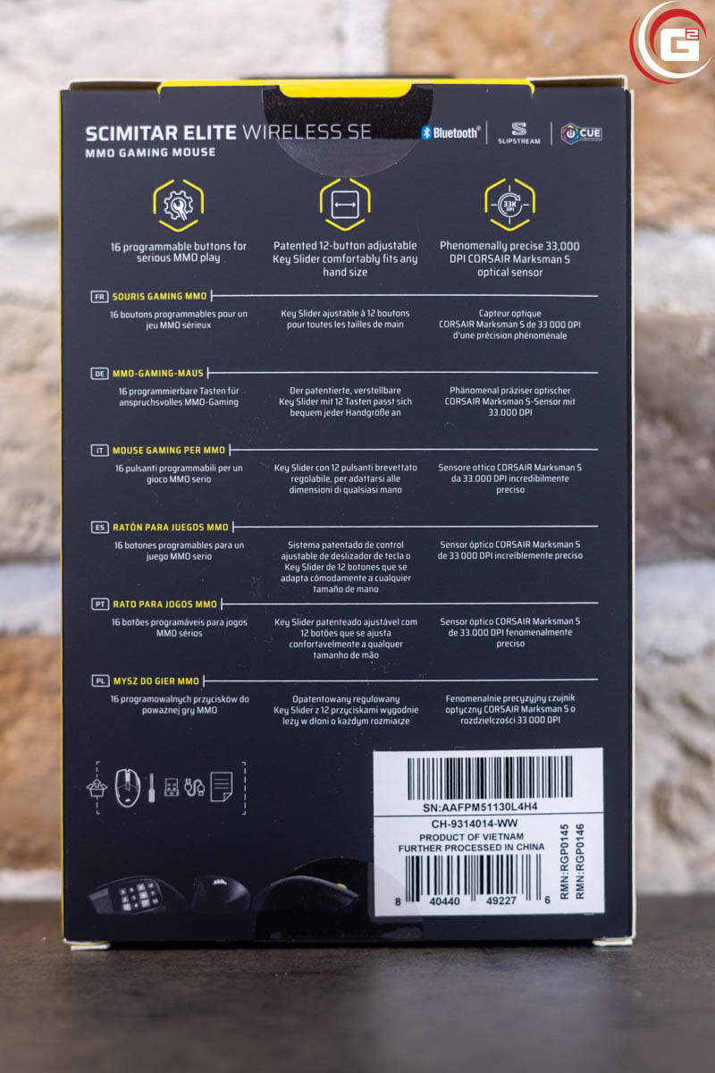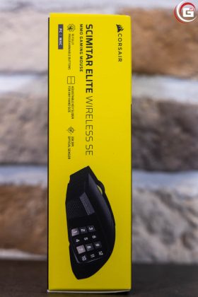 Die Umverpackung der SCIMITAR ELITE WIRELESS SE folgt dem für CORSAIR typischen Design mit schwarz-gelber Farbgebung. Die schmalen Seiten und der obere Teil der Vorderseite sind in Gelb gehalten. Zudem ist auf der Vorderseite die Maus selbst abgebildet. Die Rückseite listet einige technische Daten in verschiedenen Sprachen auf und zeigt eine beschriftete Detailabbildung.