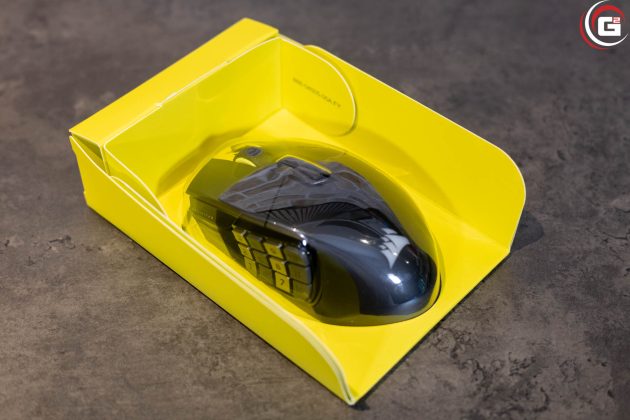 Mit ihrer ergonomischen Formgebung ist die CORSAIR SCIMITAR ELITE SE voll auf die Bedienung mit der rechten Hand ausgelegt. Dementsprechend sind die Zusatztasten auch auf der linken Seite der Maus positioniert. Bis auf einen gelben Akzent am Scrollrad und die Farben der seitlichen Zusatztasten ist die Maus vollständig in einem matten Schwarz gehalten (es gibt auch Modelle mit anderen Farbgebungen). Die zwölf Zusatztasten sind in vier Dreierreihen positioniert und mit 1 bis 12 nummeriert. Farblich sind die Reihen abwechselnd in Silber und einem Blausilber gestaltet. Mittig unterhalb der Haupttasten befindet sich der DPI-Umschalter und auf der rechten Seite der Maus ist ein Gummierung dort positioniert, wo man den kleinen Finger ablegt. Die Unterseite der Maus besitzt vier PTFE-Gleitpads und in einem Fach an der Unterseite verbirgt sich der kompakte USB-Empfänger. Das mitgelieferte Kabel ist er etwas steifer, aber es ist in erster Linie auch mehr ein Ladekabel.