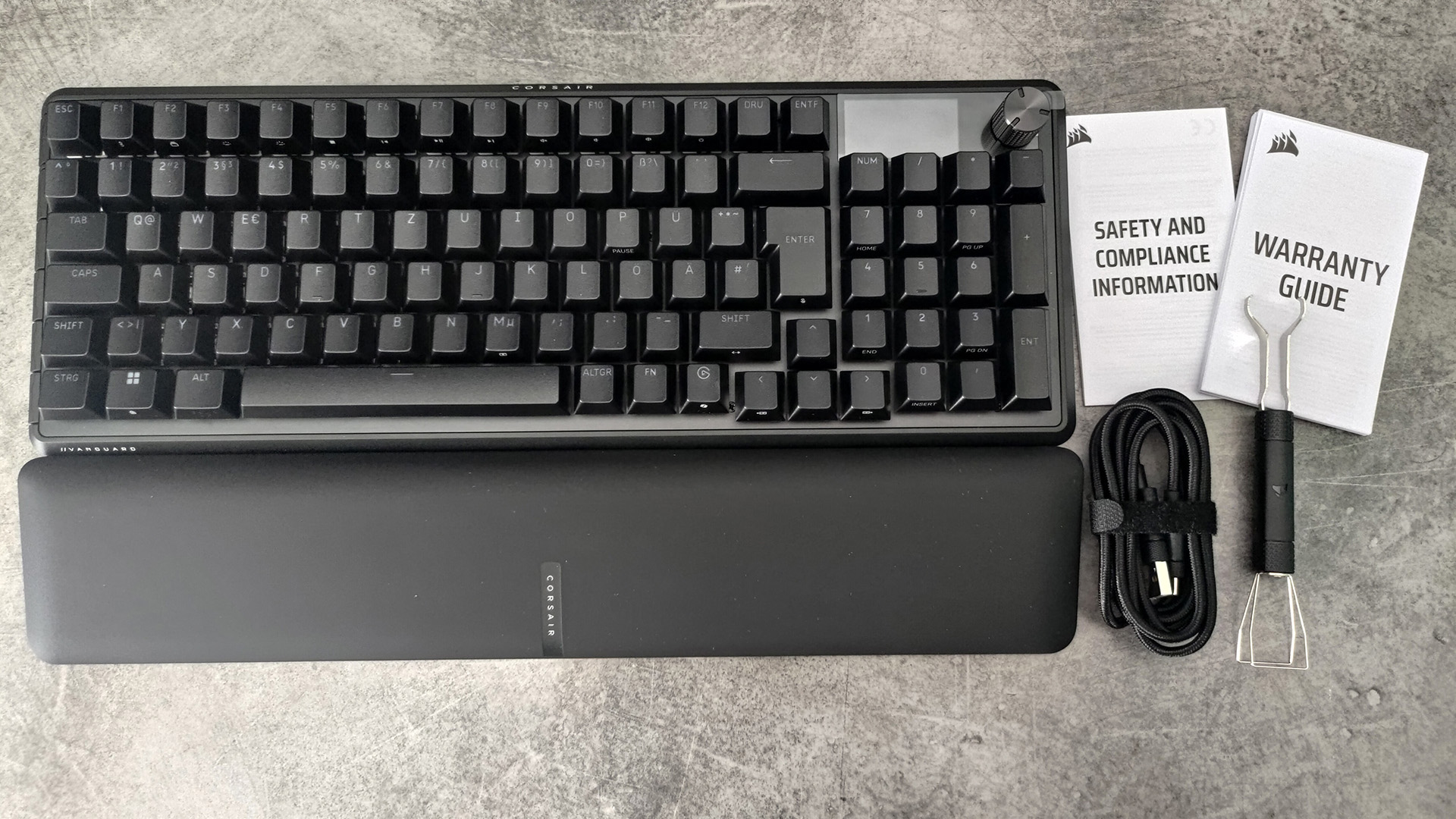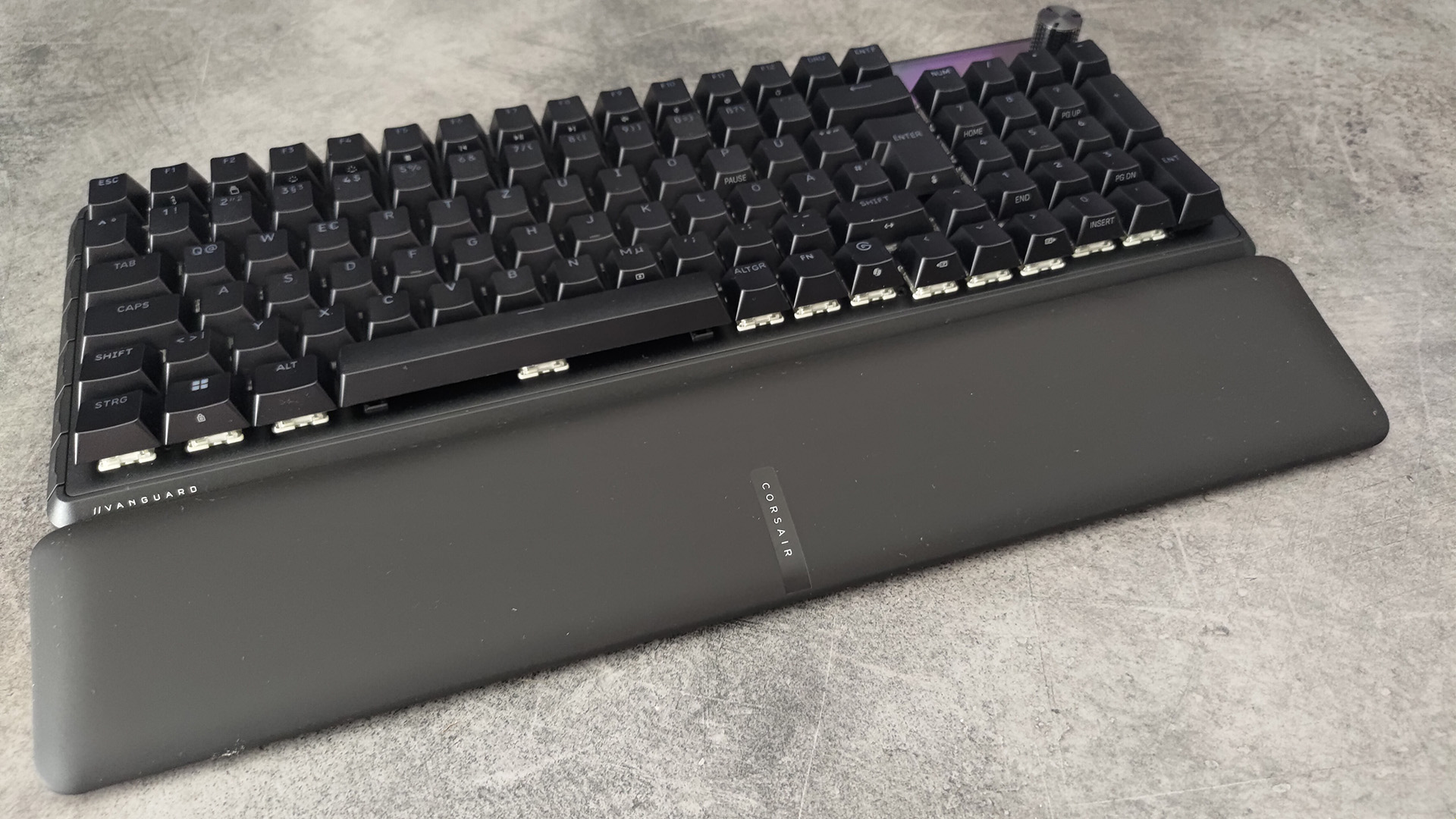 Die mitgelieferte Handballenauflage ist angenehm weich gepolstert, mit Kunstleder überzogen und trägt den CORSAIR Schriftzug, dieses Mal auch ohne die typischen CORSAIR Dreiecksmuster. Sie wird komfortabel per Magnet befestigt – praktisch und stabil zugleich.