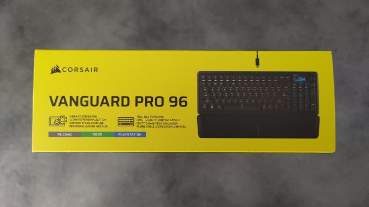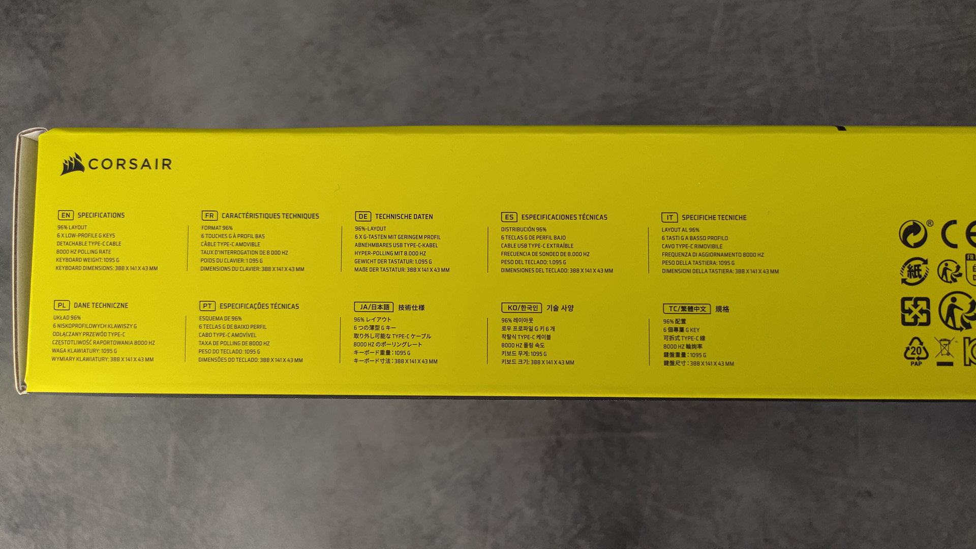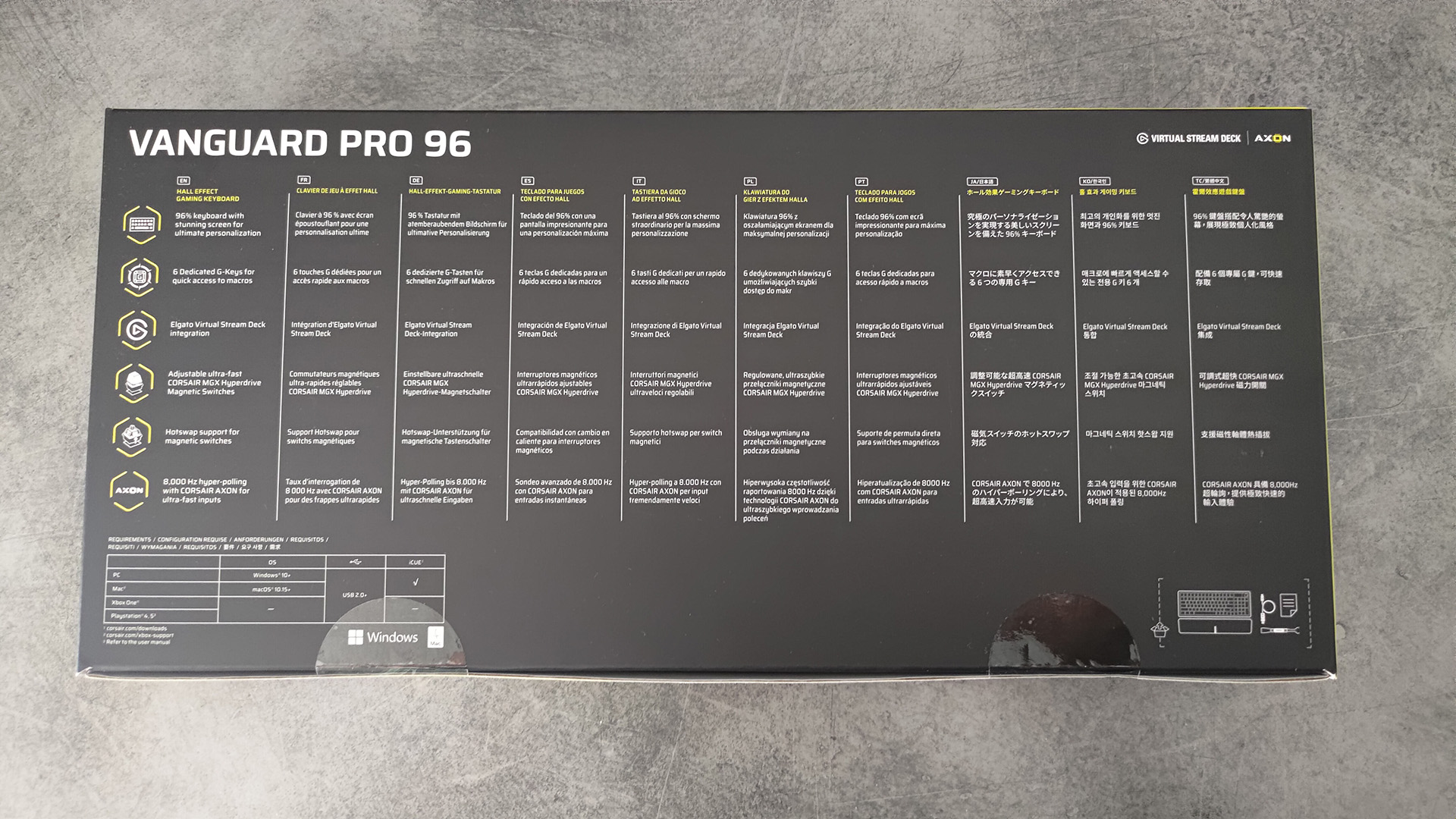 Die Verpackung der CORSAIR VANGUARD Pro 96 kommt im markentypischen gelb-schwarzen Design daher. Im Vergleich zu früheren Modellen wurde jedoch die Anordnung von Bildern und Informationen leicht verändert. Auf der Vorderseite prangt eine Produktabbildung samt Hinweis auf zentrale Funktionen, während die Rückseite zusätzliche technische Daten zeigt. Auch die Seitenflächen sind mit Abbildungen und Feature-Details versehen.