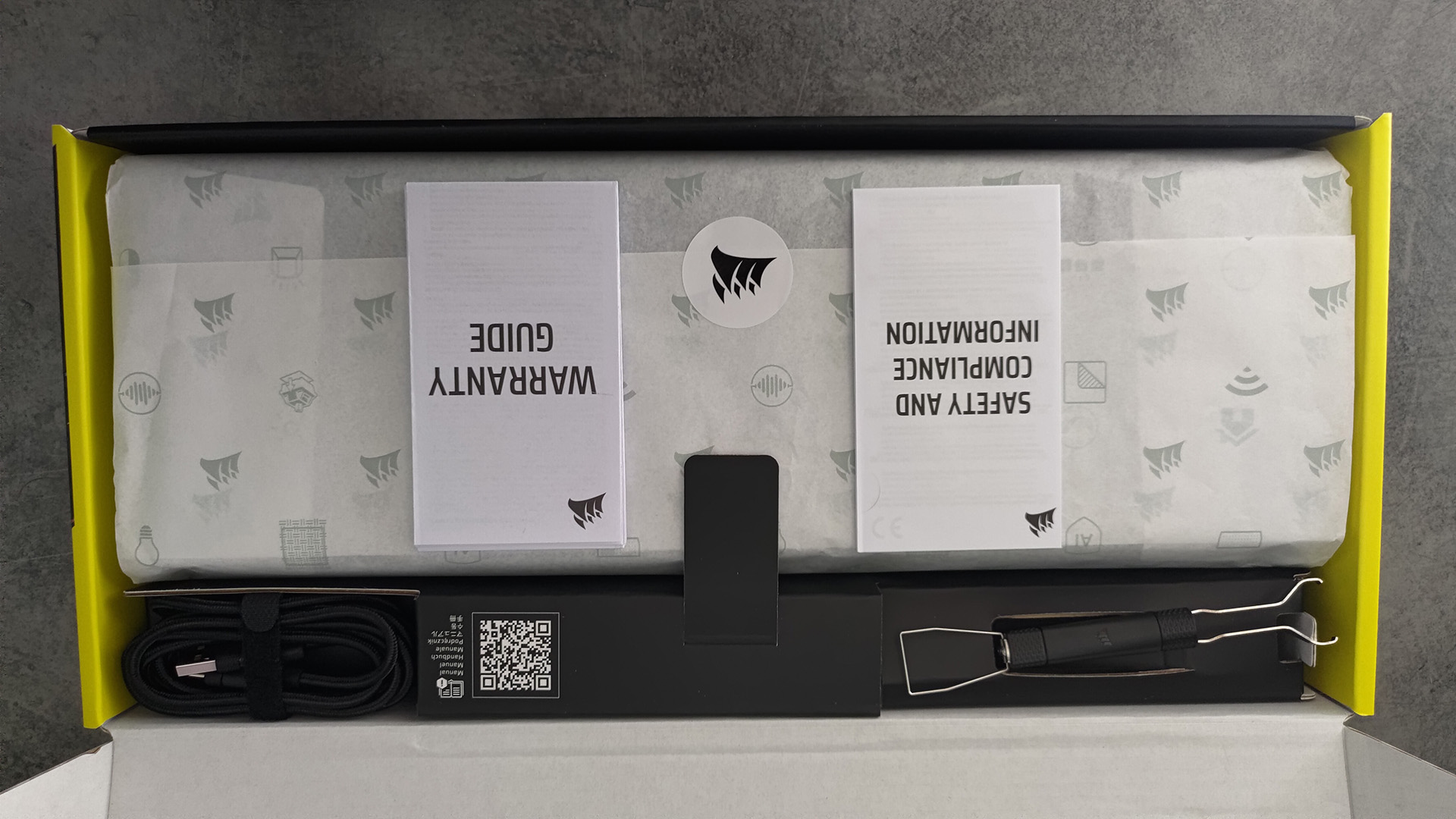 Im Inneren findet man die in Papier verpackte Tastatur, das separat beiliegende USB-Kabel sowie – im Fach unter der Tastatur – die mitgelieferte Handballenauflage.
