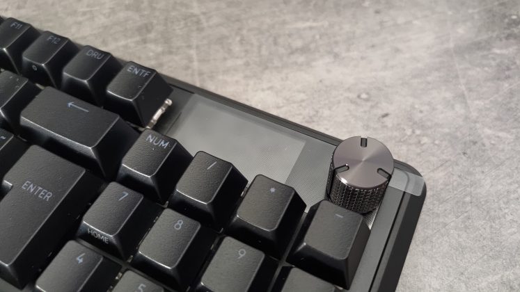 Im oberen rechten Bereich befinden sich ein Drehregler zur Lautstärkesteuerung samt Mute-Funktion. Darüber hinaus befindet sich dort ein kleines LCD-Display, welches frei konfigurierbar ist. Über das WebHub lässt sich diese wie gewohnt individuell anpassen.