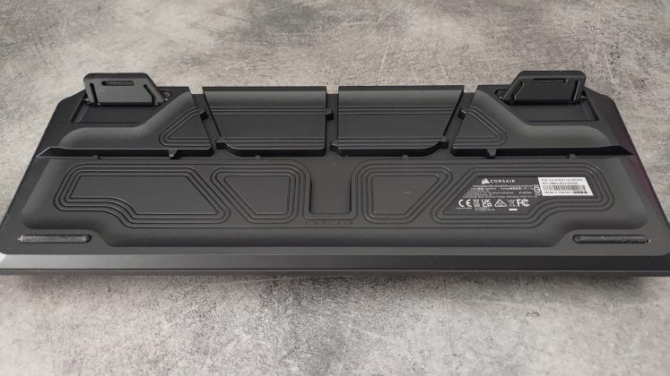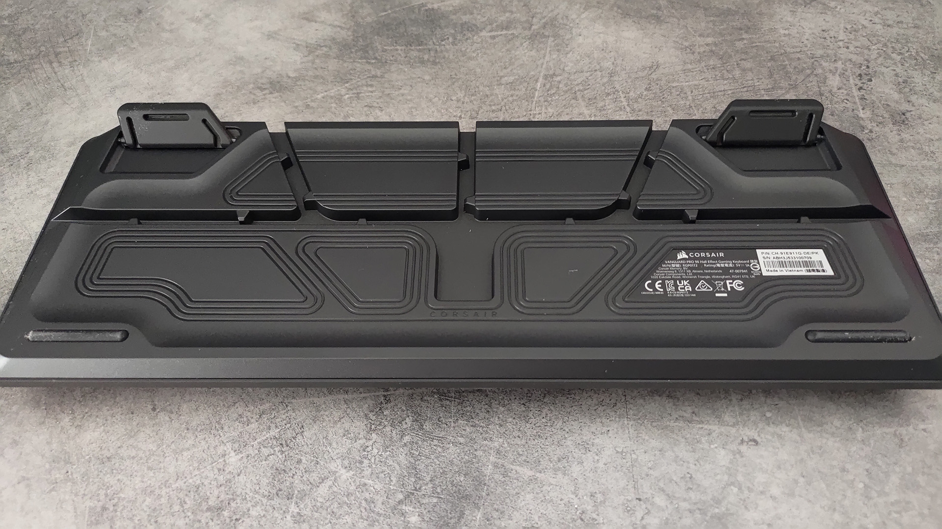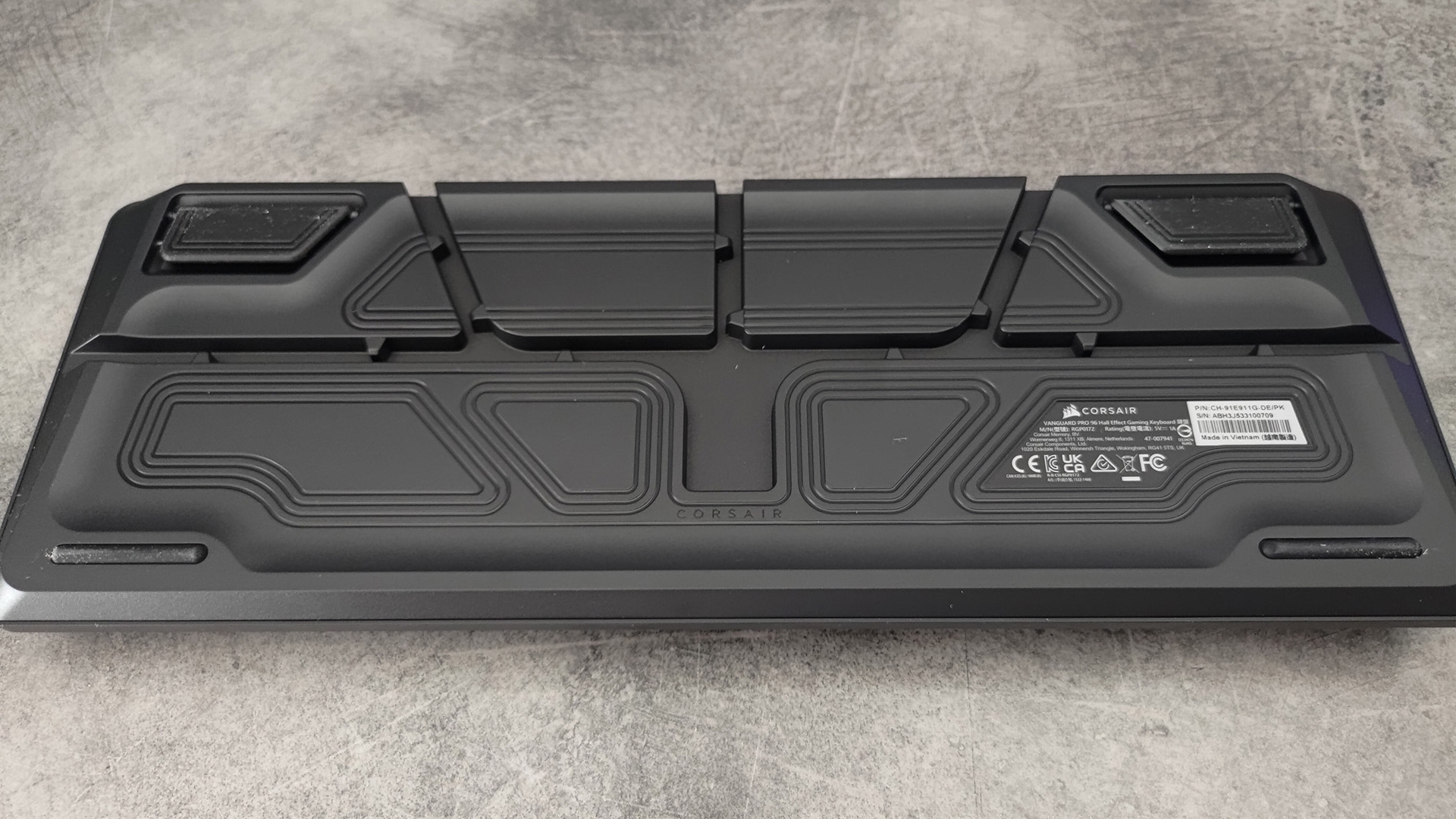 Die Höhenverstellung der CORSAIR VANGUARD PRO 96 bietet zwei Stufen, realisiert über einklappbare Stützen auf der Rückseite. Die Handballenauflage punktet mit einer angenehm weichen Haptik, griffiger Oberflächenstruktur und leichter Anpassungsfähigkeit durch die Polsterung. Für einen stabilen Stand sorgen gummierte Füße auf der Unterseite – selbst auf einem Mauspad verrutscht die Tastatur nicht. Die Keycaps besitzen zudem eine leicht angeraute Oberfläche, was sie besonders griffig macht.
