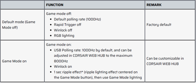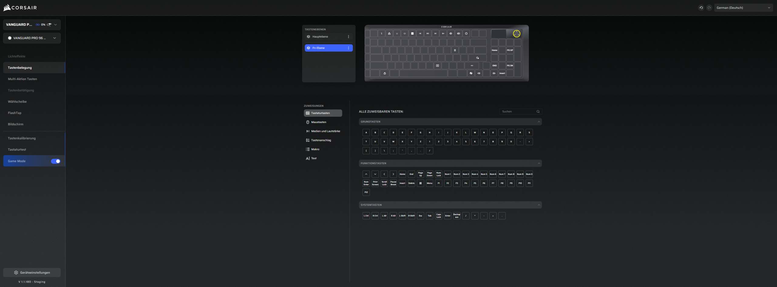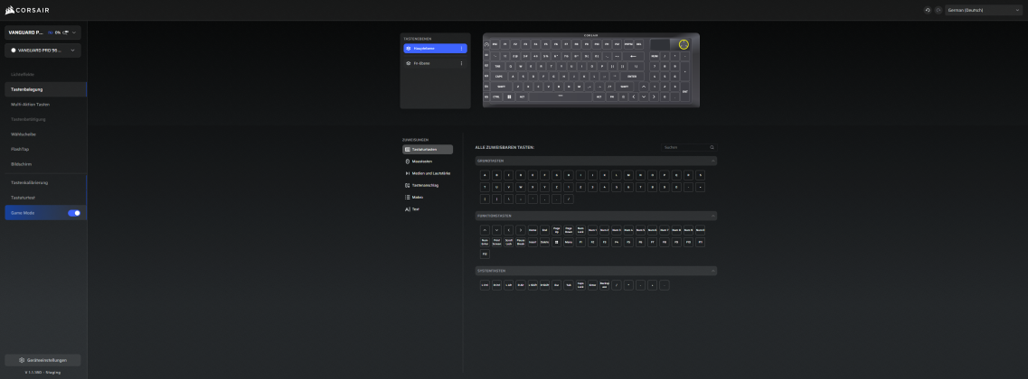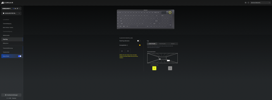 Mit einem Druck auf eine der Zusatztasten lässt sich der Spielmodus aktivieren. In diesem Modus können etwa eine erhöhte Polling-Rate, Win-Lock, FlashTap sowie alternative Tastenbelegungen hinterlegt werden. Auch die Beleuchtung der Tastatur kann automatisch auf eine einfarbige Variante wechseln. Besonders praktisch: Features wie FlashTap, Rapid Trigger oder extrem kurze Betätigungswege, die im Alltag mitunter störend wirken, lassen sich so auf das Gaming beschränken.