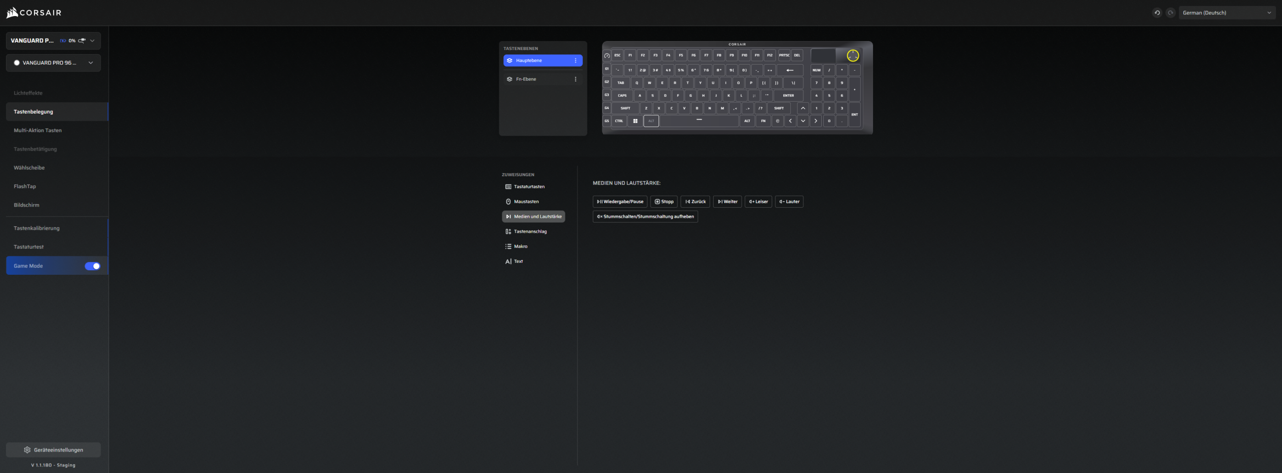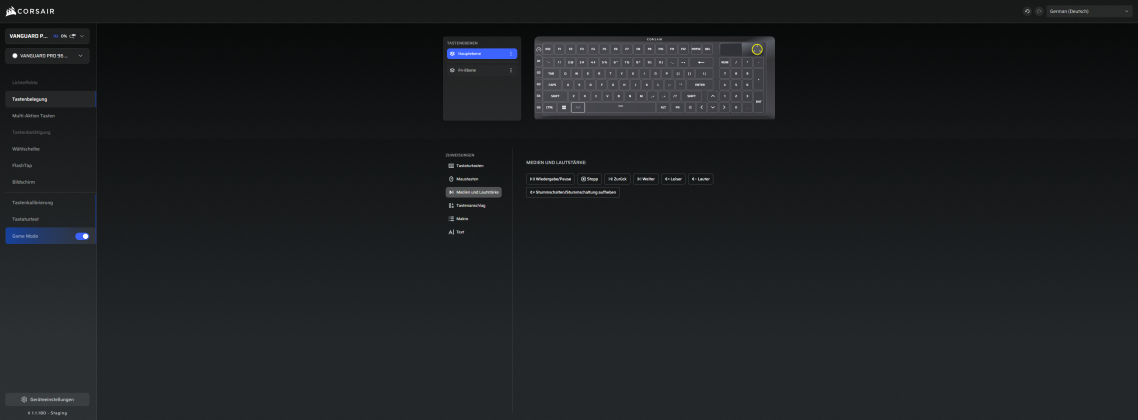 Auch akustisch macht die CORSAIR VANGUARD PRO 96 eine gute Figur: Der Tastenklang ist angenehm unaufdringlich. Hier zahlt sich die Kombination aus werkseitig geschmierten Switches und den integrierten Dämpfungsschichten aus. So bleibt die maximale Lautstärke moderat, und störender Hall im Gehäuse wird effektiv reduziert. Wer die Tasten nicht komplett bis zum Anschlag durchdrückt, kann die Lautstärke zusätzlich senken – muss sich dabei aber an eine saubere Auslösung gewöhnen.