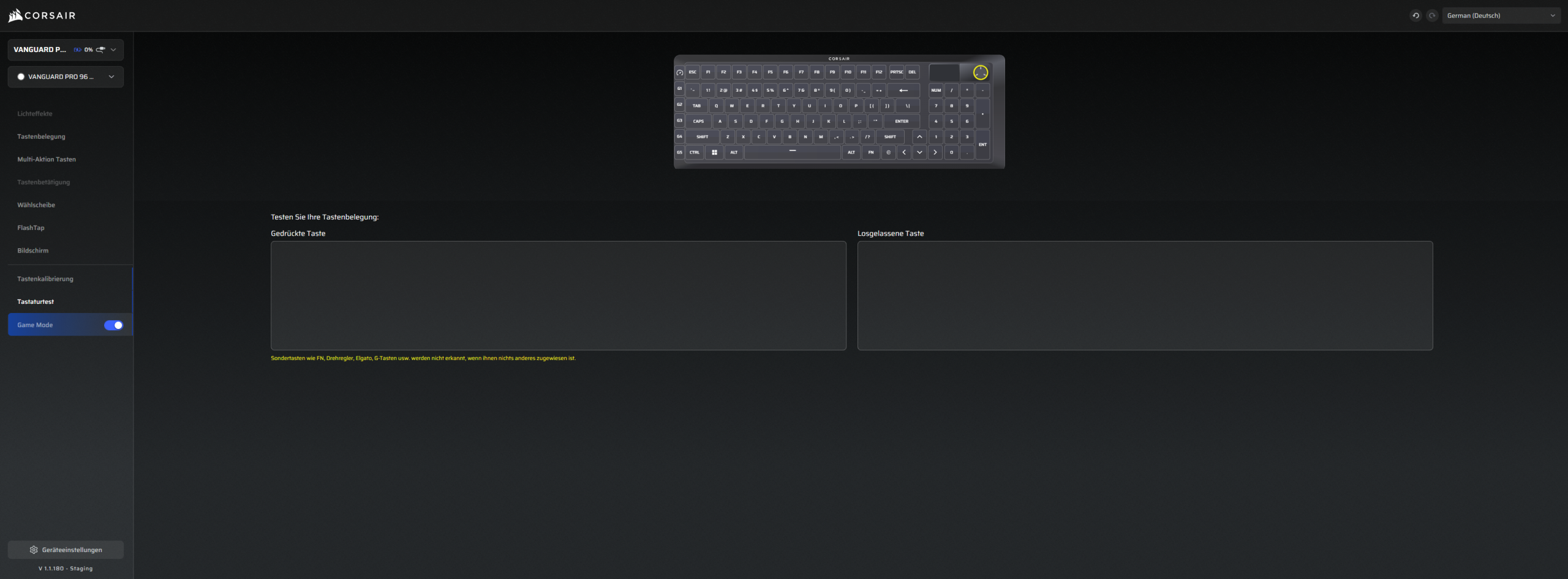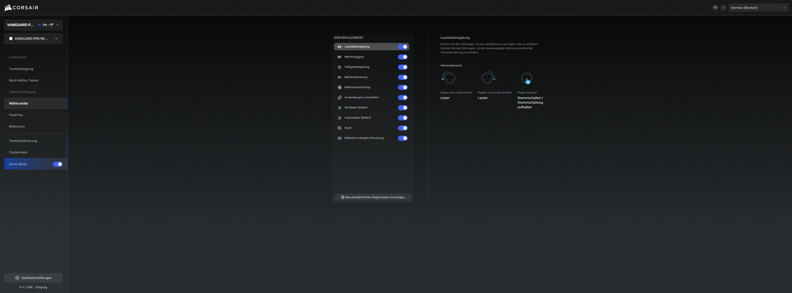 Darüber hinaus widmet sich ein eigenes Menü der Anpassung des Drehreglers. Hier stehen fünf Presets zur Auswahl, die individuell aktiviert oder deaktiviert werden können. Unter den allgemeinen Optionen finden sich außerdem Einstellungen für die WIN-LOCK-Funktion, die Anzeige von FN-Verknüpfungen und die FlashTap-Technologie. Ergänzend gibt es einen Spielmodus, der sich separat konfigurieren lässt.