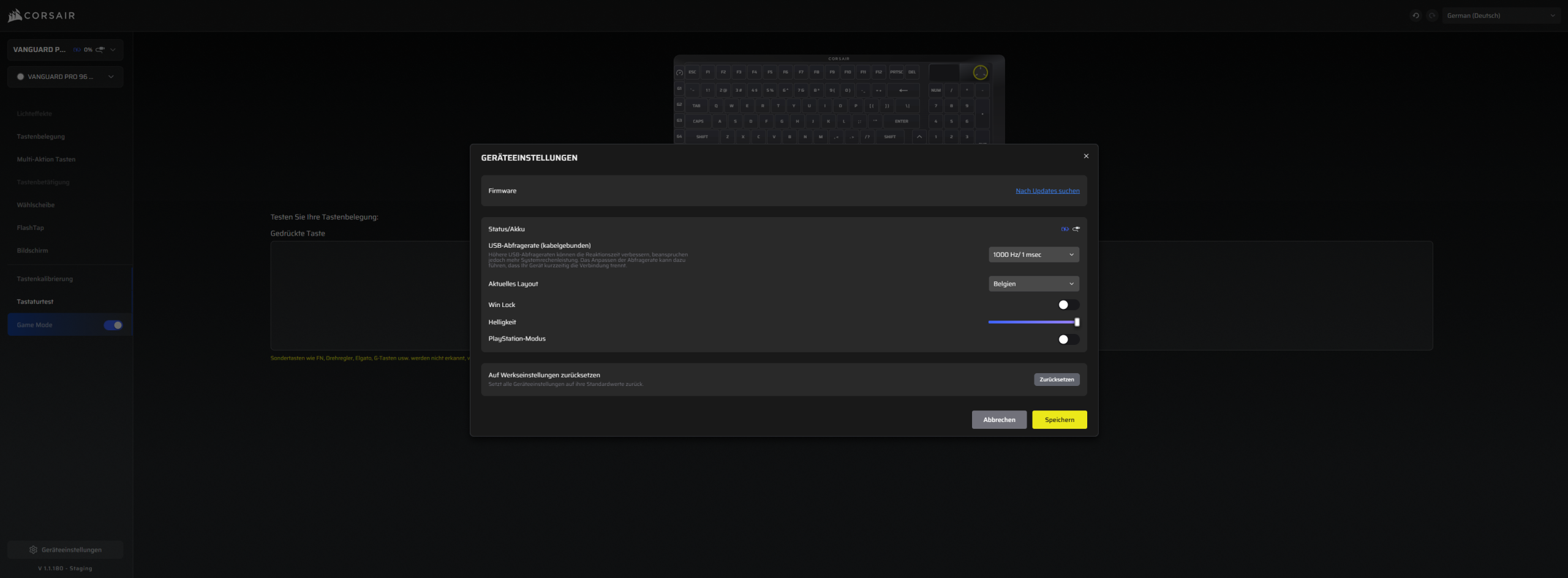 Abgerundet wird das Ganze durch die Geräteeinstellungen: Hier lassen sich Firmware-Updates einspielen, die Polling-Rate anpassen, die Helligkeit regulieren und die Profilspeicher zurücksetzen.