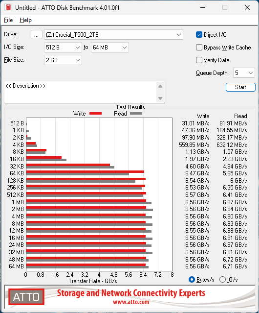 | Crucial T500 2TB | 4 KB Q1T1 Lesen | 4 KB Q1T1 Schreiben |