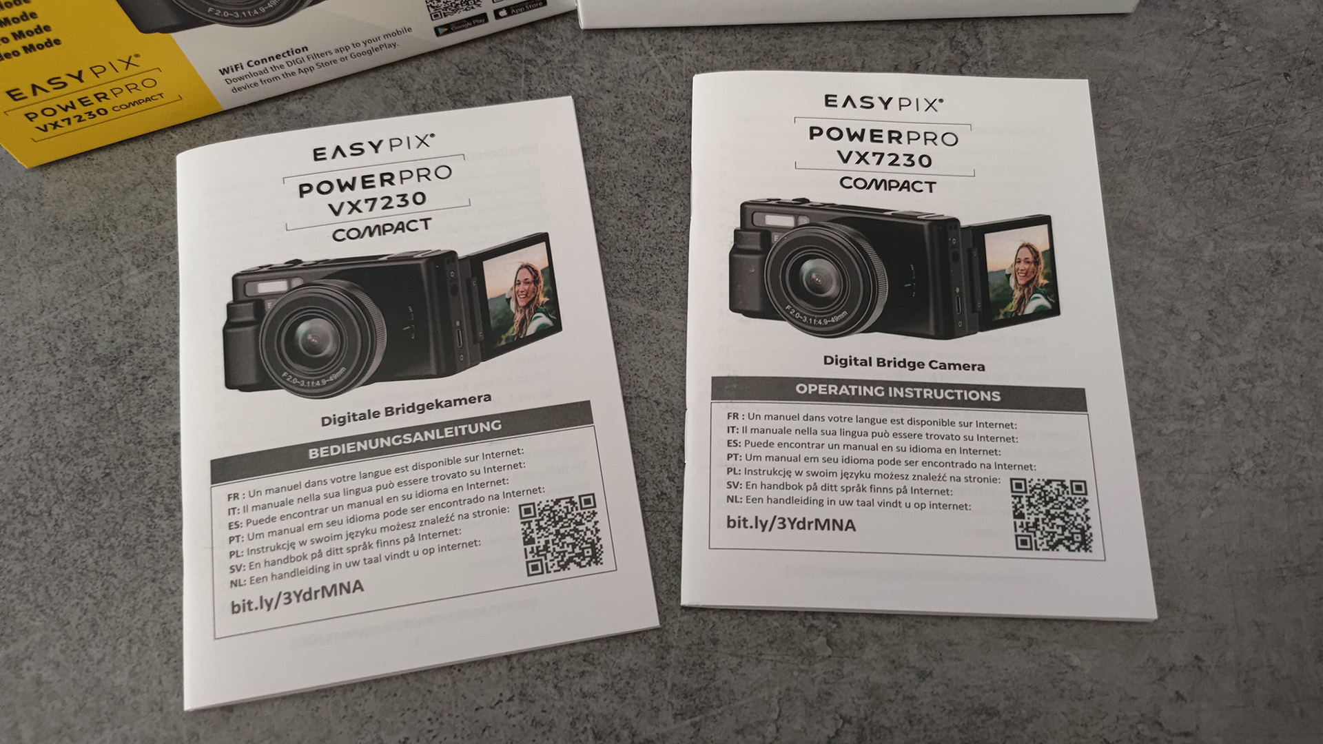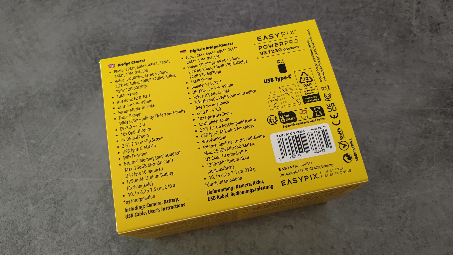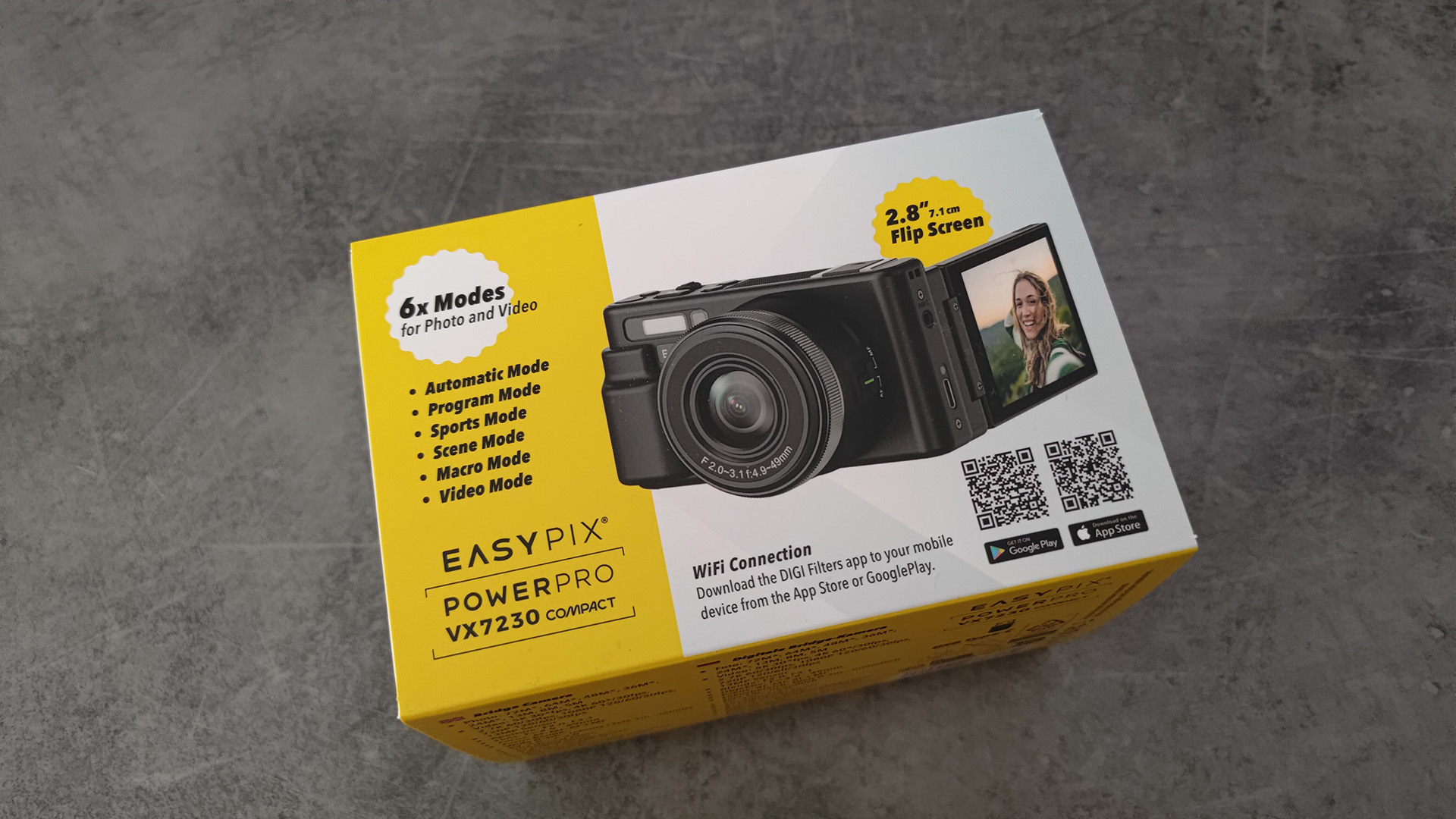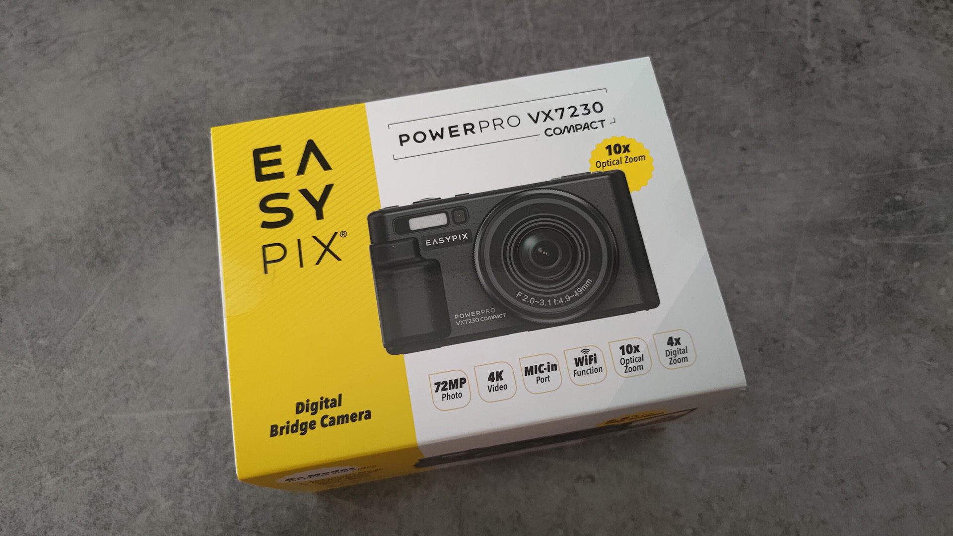 Die Verpackung der Easypix PowerPro VX7230 Compact Kamera wirkt modern und auffällig gestaltet. Sie kombiniert ein kräftiges Gelb mit weiß-grauen Flächen, was sofort ins Auge sticht und einen frischen, technischen Eindruck vermittelt.