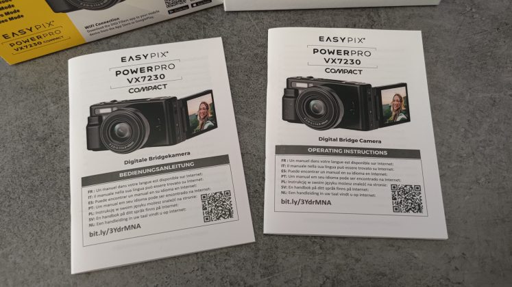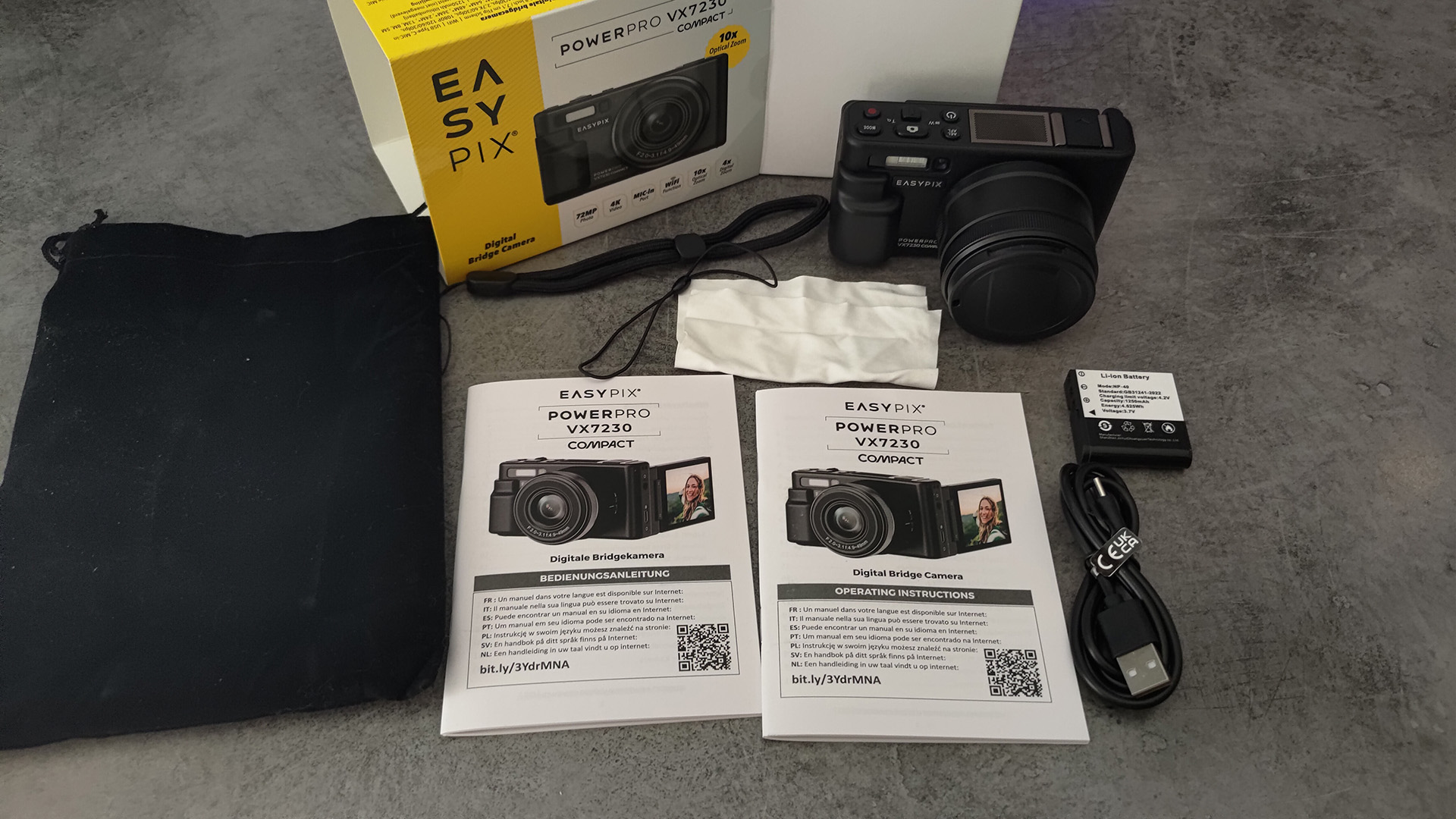 Easypix PowerPro VX7230 Compact, 1250 mAh Lithium-Ionen-Akku (austauschbar), USB Type-C Kabel und eine Bedienungsanleitung.