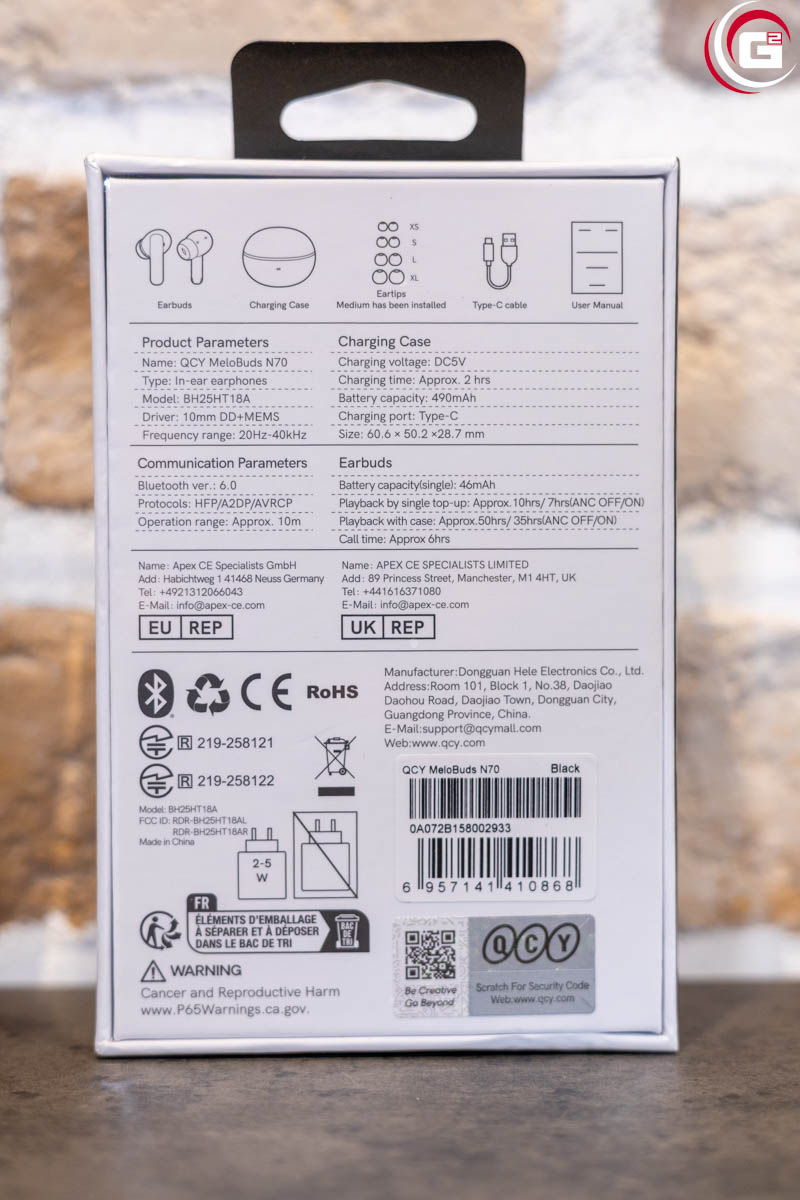 Die QCY MeloBuds N70 werden in einer kompakten Umverpackung geliefert. Diese setzt auf Weiß als Grundfarbe, mit zwei Längsseiten in Schwarz. Auf der Vorderseite ist eine Produktabbildung mit Hinweisen auf zentrale technische Features zu finden. Auf der Rückseite sind ausführlichere technische Details aufgelistet.