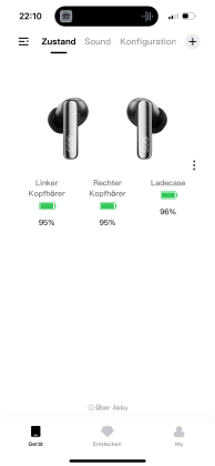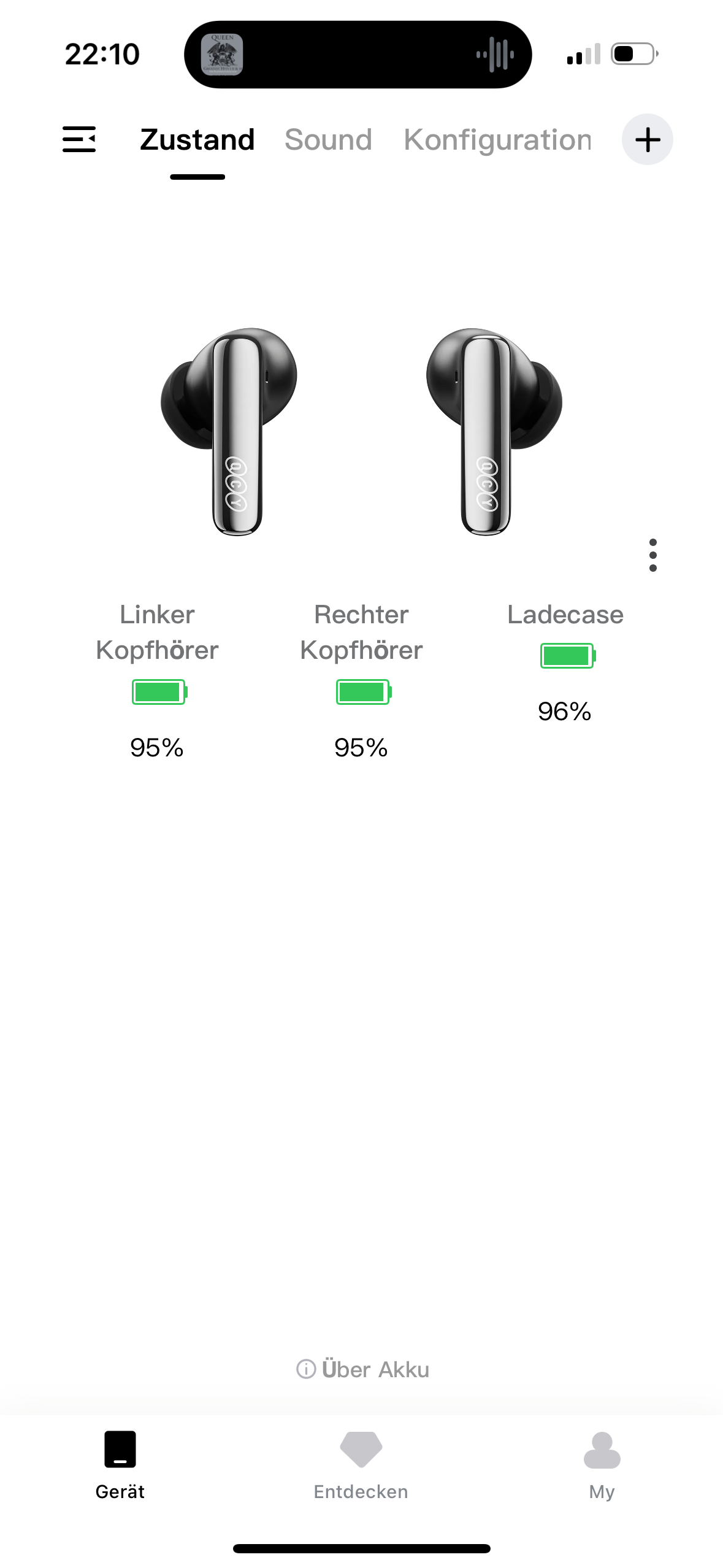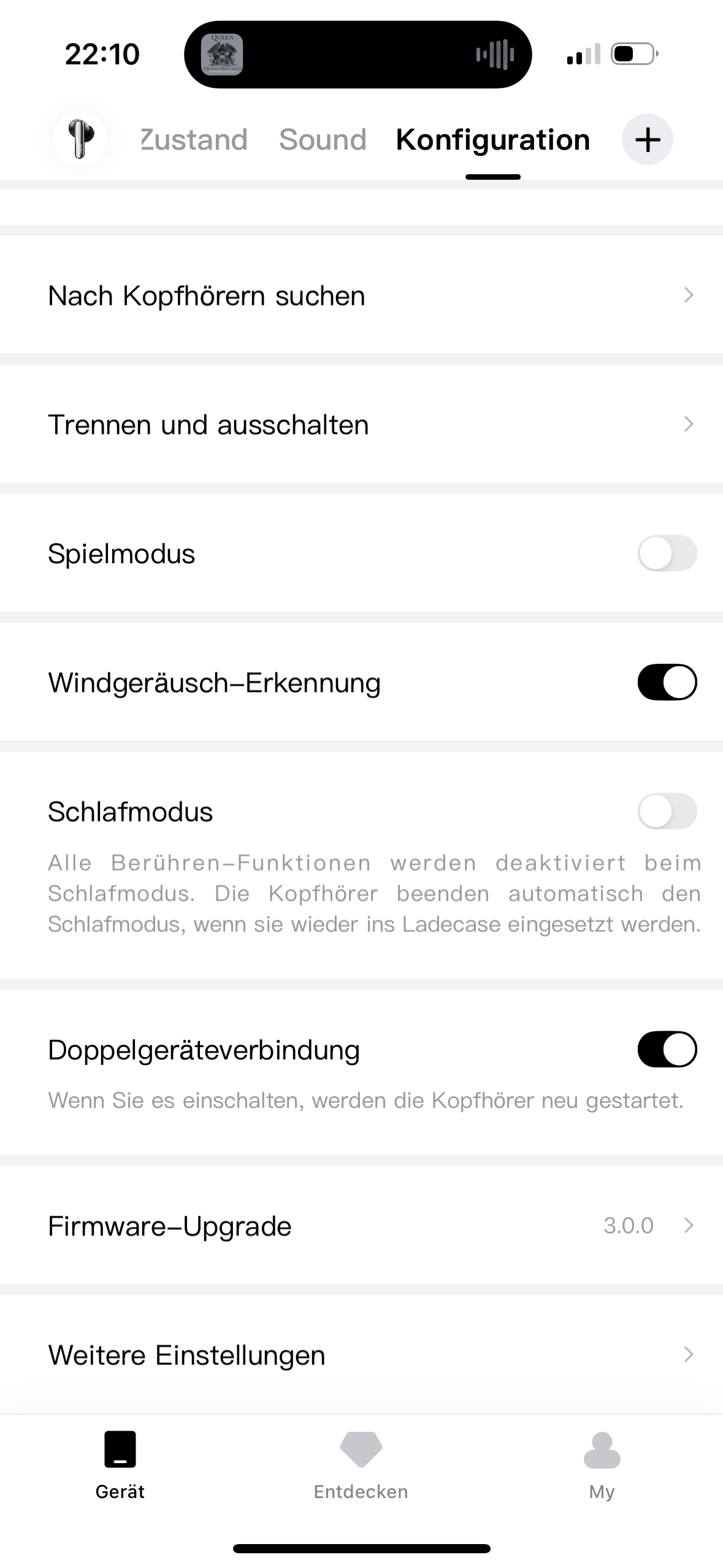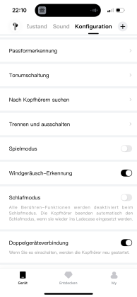 Für iOS bietet QCY zwei verschiedene Apps, wovon sich eine an die Smarthome-Produkte richtet. Für unsere In-Ear-Kopfhörer benötigen wir die, die nur den Namen QCY trägt. Auf der ersten Seite zeigt diese, wenn die Verbindung aufgebaut ist, den Ladezustand von Case und In-Ear Kopfhörern an. Mit der App kann man aber natürlich mehr, als sich nur den Ladezustand anzeigen zu lassen. Man kann den Klang optimieren, den ANC-Modus anpassen, die Kanalbalance ändern, die Bedienungsgesten individualisieren und noch vieles mehr. Es gibt auch noch einen Spielmodus, eine Windgeräusch-Erkennung und auch einen Schlafmodus. Natürlich kann man über die App auch die Firmware der In-Ear-Kopfhörer verbessern. All diese Optionen sind auf zwei weitere Fenster aufgeteilt.