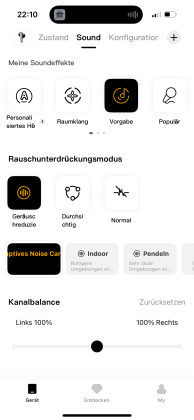 Für die Klanganpassung gibt es verschiedene Möglichkeiten. Es gibt einen Equalizer für individuelle Profile, man kann aber auch Presets wählen, wovon sich eines insbesondere an Raumklang richtet. Darüber hinaus kann man ein individualisiertes Hörprofil erstellen, in dem man bei Beispielwiedergaben angibt, wie einem der Klang gefällt. Es gibt auch einen Assistenten für die Passformerkennung der Ohrstöpsel, denn für eine gute Audiowiedergabe ist auch die Passform entscheidend.