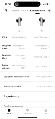 Zur Bedienung der QCY MeloBuds N70 nutzt man verschiedene Tippgesten, vom langen Drücken bis hin zu Dreifachtippen. In der QCY-App kann eingestellt werden, welche Funktionen so aufgerufen werden können. Hier stehen Funktionen zur Medien- oder Sprachsteuerung zur Verfügung. Standardmäßig ist das Doppeltippen auf beiden Seiten für Wiedergabe/Pause konfiguriert. Das dreifache Tippen hingegen schaltet, abhängig von der Seite, ein Lied vor oder zurück. Langes Drücken aktiviert auf der linken Seite den Sprachassistenten und auf der rechten Seite kann man so den ANC-Modus umschalten.