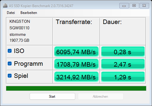 AS SSD bietet auch ein Kopierbenchmark, dieser überprüft das Verschieben von Daten auf der NVMe. Hierbei werden drei Szenarien getestet: ein Transfer einer ISO-Datei (zwei große Dateien), eines Programms (kleine Dateien) und eines Spiels (große und kleine Dateien).