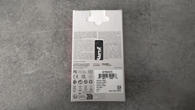 Die Verpackung hinterlässt einen hochwertigen Eindruck. Im Gegensatz zur KC-Serie von Kingston verzichtet man hier auf eine einfache Blisterverpackung. Auf der Vorderseite sind alle wichtigen Informationen übersichtlich platziert: Modellbezeichnung, Speicherkapazität, maximale Lesegeschwindigkeit und der Hinweis auf die PCIe-5.0-NVMe-Technologie.