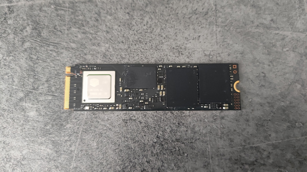 Die Kingston Fury Renegade G5 präsentiert sich als doppelseitig bestückte M.2-SSD – eine Seltenheit in der Welt der NVMe-Laufwerke. Während viele Hersteller mittlerweile auf einseitige Layouts setzen, nutzt Kingston hier beide Seiten des PCBs voll aus. Jede Seite ist millimetergenau mit identischen NAND-Modulen bestückt – ein beeindruckendes Stück Ingenieurskunst.