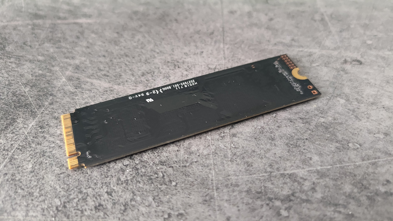 Natürlich konnten wir der Versuchung nicht widerstehen: Trotz des deutlichen Warnhinweises („Garantieverlust beim Entfernen“) wanderte der Aufkleber kurzerhand in den Müll – und die Rückseite kam zum Vorschein. Das ermöglichte uns einen genaueren Blick auf den Aufbau und das thermische Design der SSD. Besonders spannend, da wir die Fury Renegade in unseren Benchmarks ohne Kühler oder Mainboard-Shield testen werden. Wie sie sich dabei schlägt, zeigen wir im weiteren Verlauf des Tests.