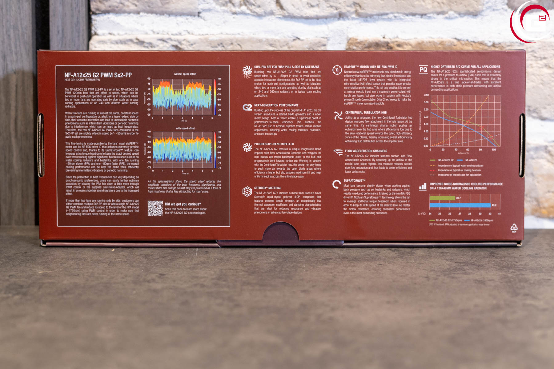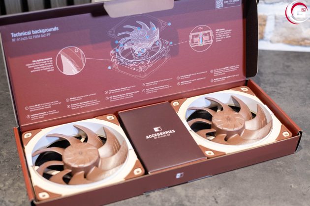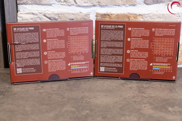 Die Umverpackung der verschiedenen Noctua NF-A12x25 G2-Modelle folgt dem aktualisieren Design mit charakteristischem, brauen Hintergrund mit Farbverlauf. Auf der Vorderseite findet sich eine Produktabbildung und auf der Rückseite werden technische Details aufgelistet. Klappt man die Verpackung auf, blickt man direkt auf die Lüfter und findet noch genauere Beschreibungen einiger technischer Features.