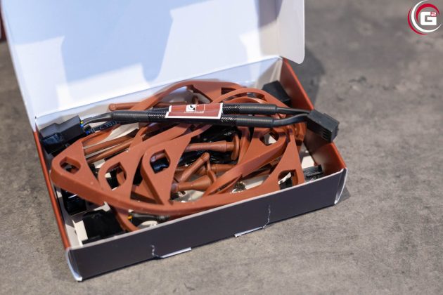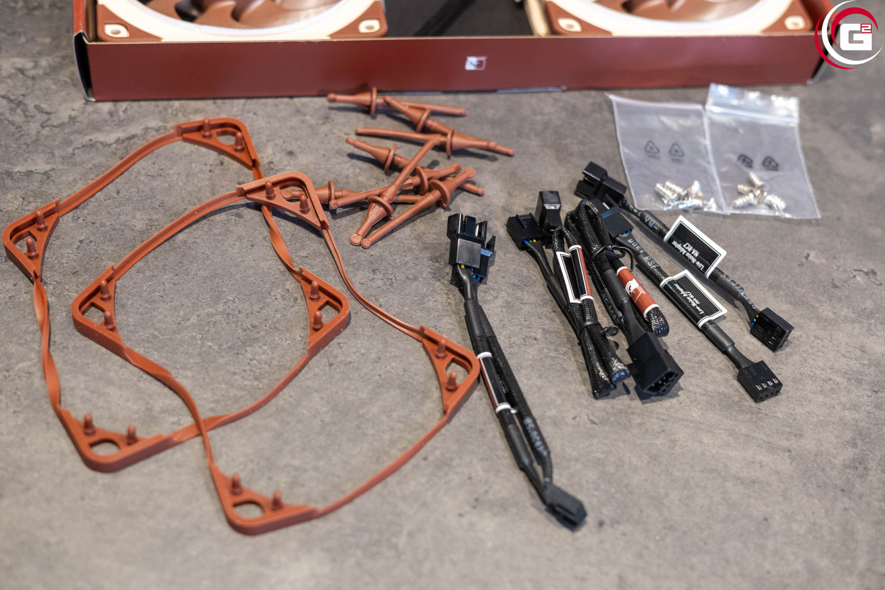 Im Lieferumfang findet sich für jeden der Lüfter ein ausführliches Zubehörpaket, bestehend aus einem NA-EC1 30 cm Verlängerungskabeln, einem NA-RC16 Low-Noise-Adaptern, den NA-AVG2-LR Anti-Vibrations-Dichtlippen für Wasserkühlungsradiatoren, vier NA-AVP1-LR Anti-Vibrations-Pads mit Entlastungsringen, vier NA-AV2 Anti-Vibrations-Befestigungen und Lüfterschrauben. Im Fall des Sx2-PP-Kits liegt noch ein NA-YC1 4-Pin PWM Verteilerkabel bei. Zur Unterscheidung sind die Lüfter hier als PPA und PPB gekennzeichnet.