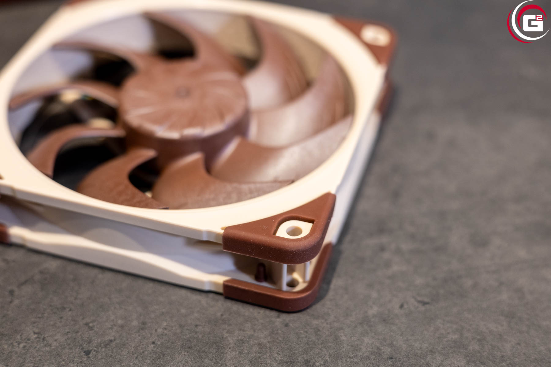 Dem Noctua NF-A12x25 G2 sieht man direkt an, dass es sich um einen Lüfter von Noctua handelt. Das Design ist in der für Noctua typischen Farbkombination gehalten: Ein beiger Rahmen nimmt einen braunen Rotor auf und am Rahmen sind ebenso braune Gummidämpfer montiert. Die Farbgebung ist insgesamt gleichmäßig, aber insbesondere am Rotor lässt sich der Glasfaseranteil des Kunststoffs erkennen.