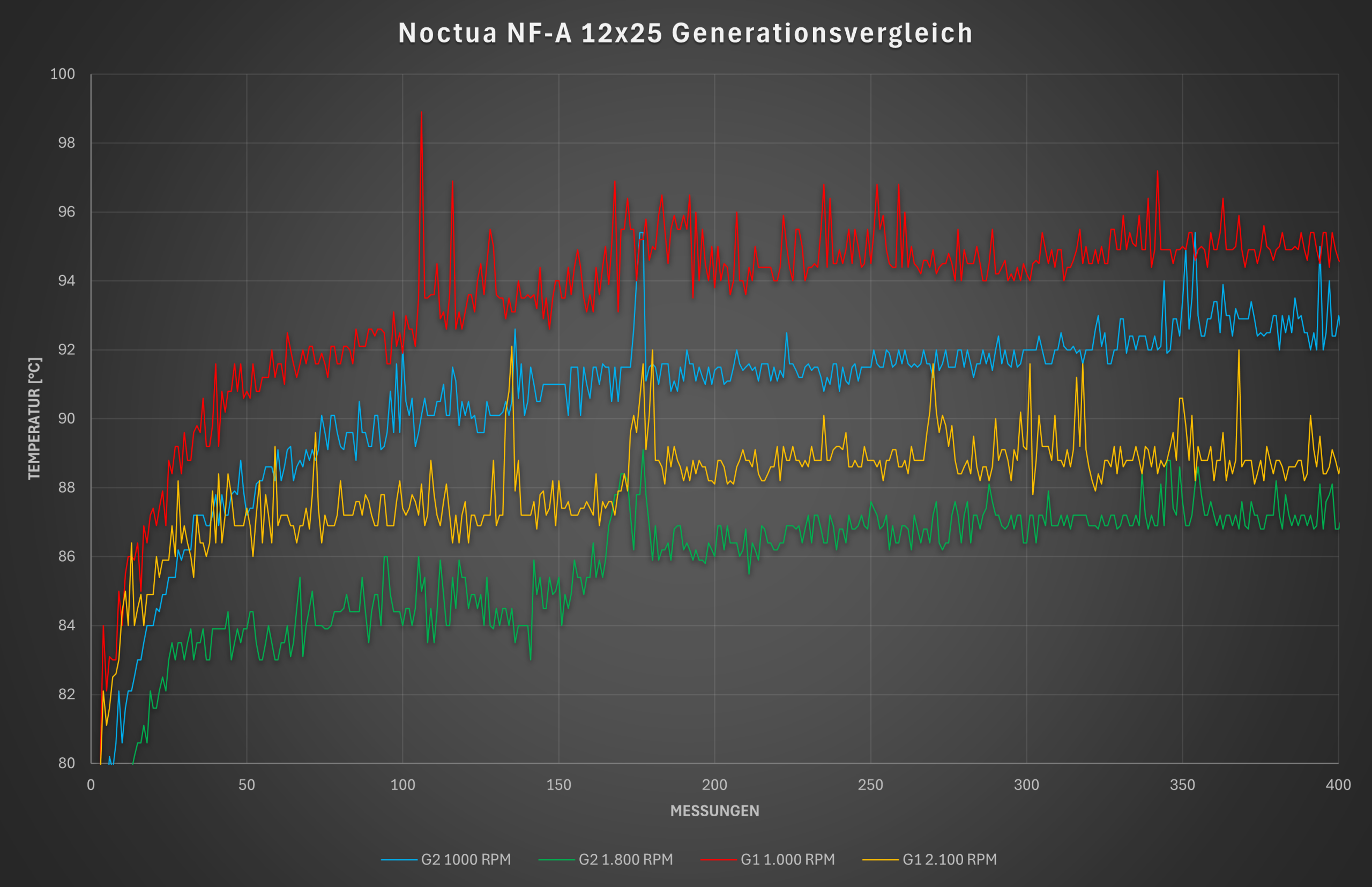 Nachfolgend haben wir einmal den Temperaturverlauf aus den Benchmark-Durchläufen mit dem NH-U12A in der Standardkonfiguration mit den Lüftern der 1. Generation (G1) im Vergleich zum Einsatz mit den Noctua NF-A12x25 G2 Sx2-PP (G2) dargestellt.
