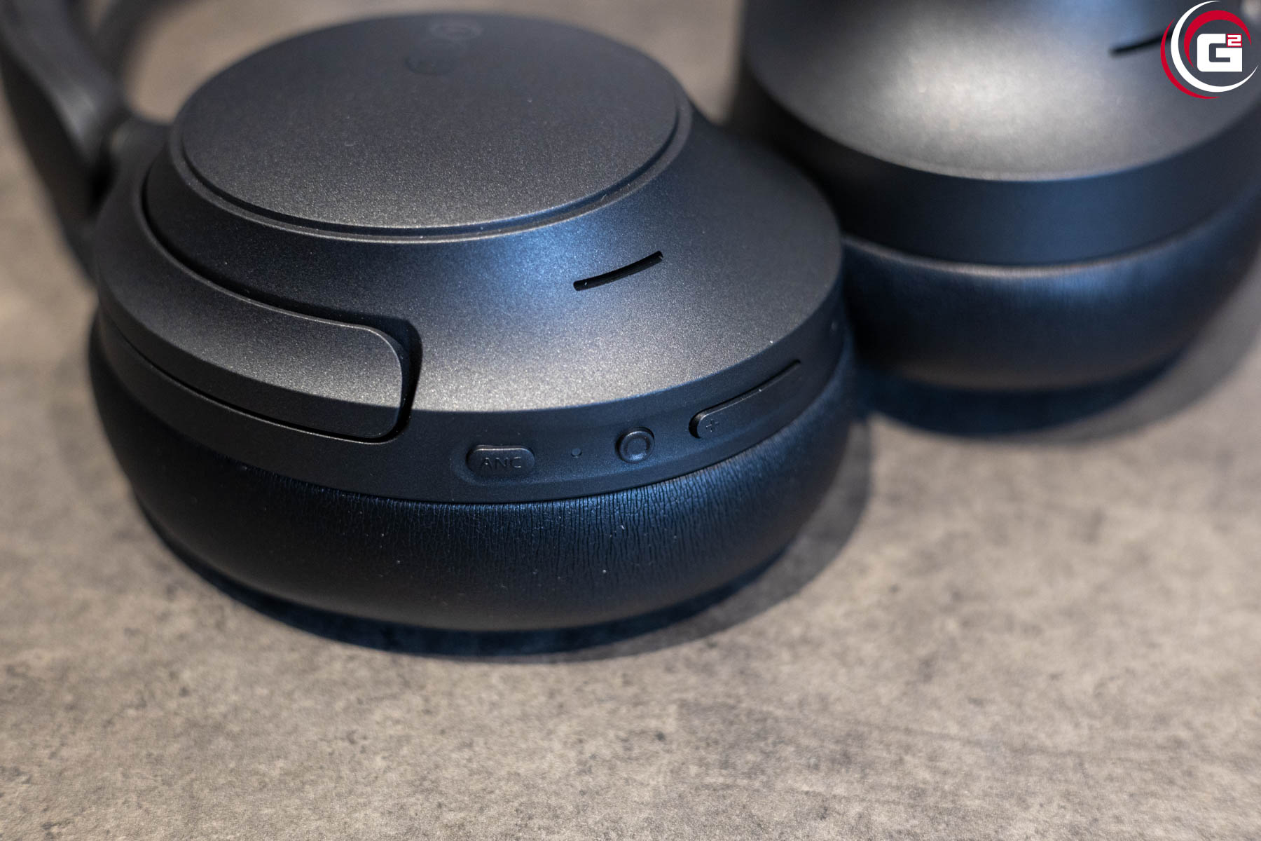 Zur Bedienung der QCY H3S stehen drei Bedienelemente an der rechten Ohrmuschel zur Verfügung. Eine Taste ermöglicht das Ein-/Ausschalten des ANC und auch das Durchschalten der unterschiedlichen Modi. Mittig findet sich der Ein-/Ausschalter, mit dem wir durch langes Drücken die Kopfhörer ein- bzw. ausschalten. Über einen kurzen Klick kann man mit diesem bei einer aktiven Audiowiedergabe pausieren und fortsetzen. Daneben befindet sich ein Doppeltaster zur Lautstärkereglung. Ebenfalls auf der rechten Seite ist der USB-C-Ladeanschluss zu finden.