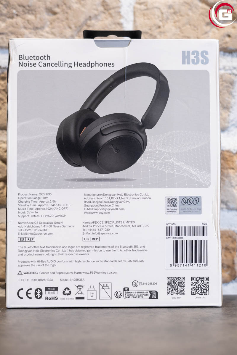 Die QCY H3S werden in einer überraschend kompakten Umverpackung geliefert. Diese folgt dem charakteristischen Design und setzt auf Weiß als Grundfarbe, mit zwei Längsseiten in Schwarz. Auf der Vorderseite ist eine Produktabbildung mit Hinweisen auf zentrale technische Features zu finden. Auf der Rückseite sind ausführlichere technische Details aufgelistet.