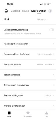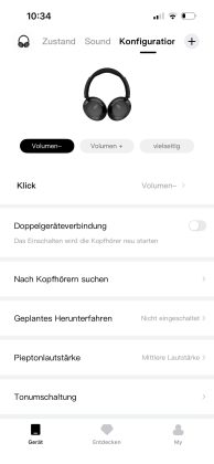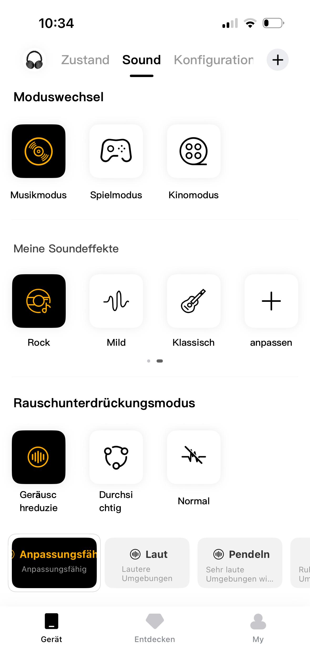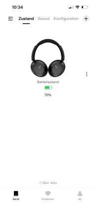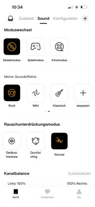 Die Optionen für die Klanganpassung finden sich auf der Registerkarte Sound. Zunächst gibt es einen Musik-, einen Spiel- und einen Kinomodus. Darauf folgen als Soundeffekte die Equalizer-Presets: Raumklang, Vorgabe, Populär, Bass, Rock, Mild und Klassik. Darüber hinaus lassen sich eigene Presets erstellen. Auch die ANC-Einstellungen finden sich hier, man kann ANC abschalten, den Transparenz- und den Geräuschunterdrückungsmodus wählen. Ist letzterer aktiv, hat man die Wahl zwischen Windgeräuschreduzierung, Indoor, Pendeln, Laut und Adaptiv. So kann man entweder manuell den benötigten Modus wählen oder den Kopfhörer diese Einstellungen automatisch vornehmen lassen.