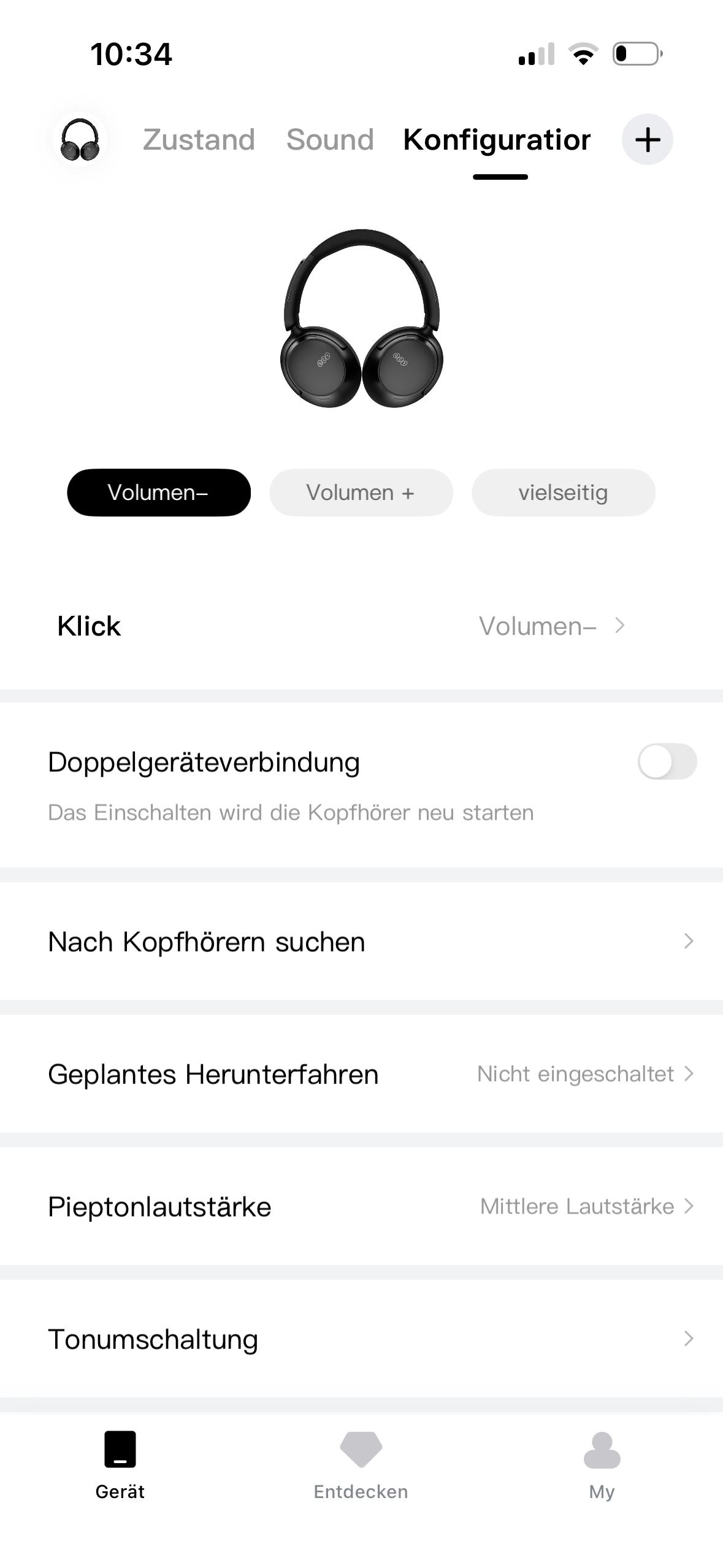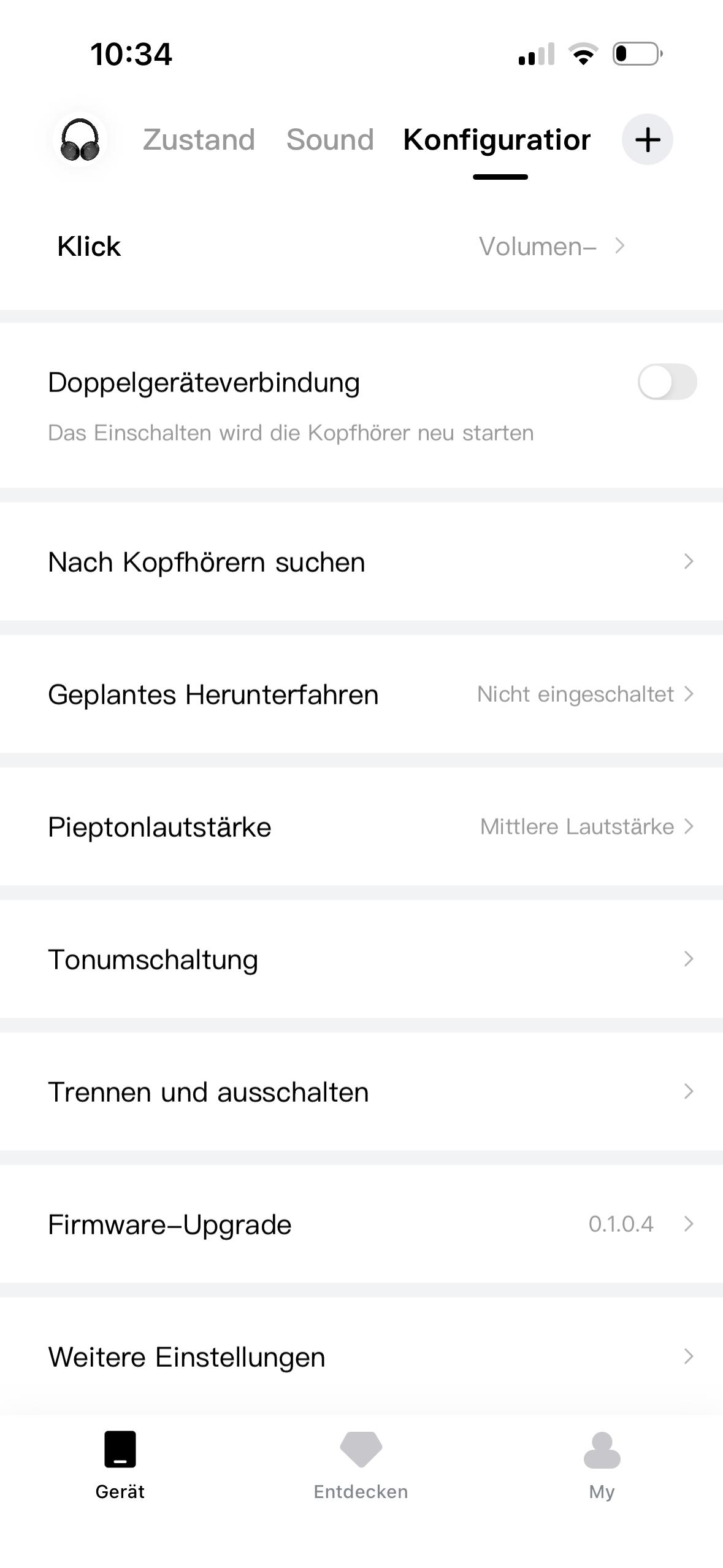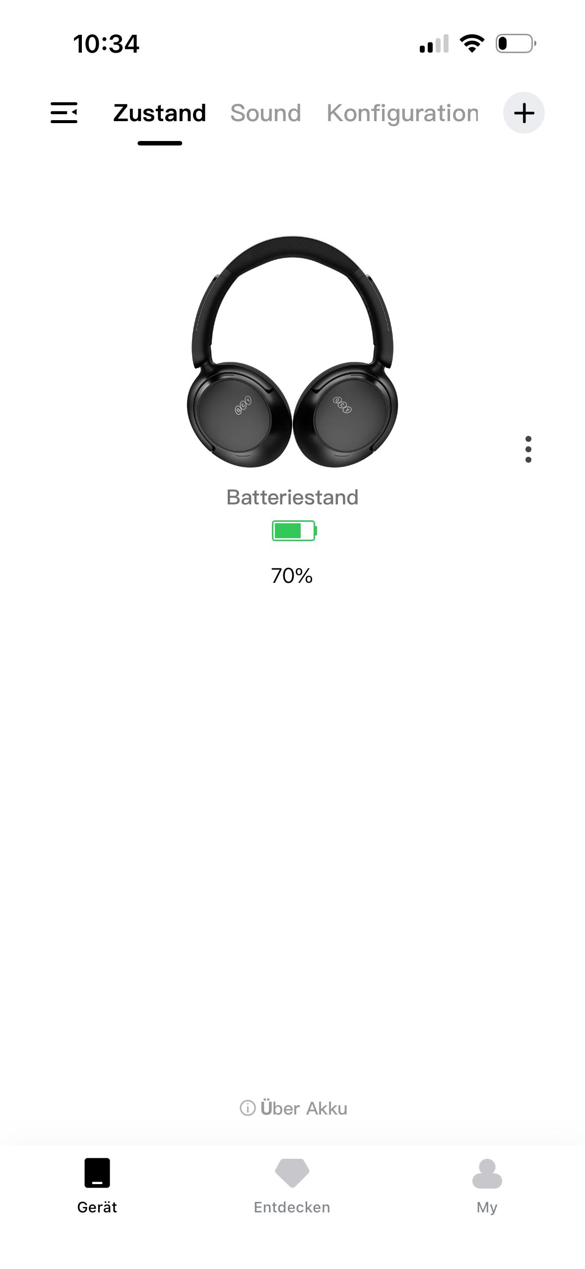 Für iOS bietet QCY zwei verschiedene Apps, wovon sich eine an die Smarthome-Produkte richtet. Für unsere Over-Ear-Kopfhörer benötigen wir die, die nur den Namen QCY trägt. Auf der Startseite zeigt diese, wenn die Verbindung aufgebaut ist, den Ladezustand der verbundenen Kopfhörer an. Mit der App kann man aber natürlich mehr, als sich nur den Ladezustand anzeigen zu lassen. Man kann den Klang optimieren, den ANC-Modus anpassen, die Kanalbalance ändern und noch vieles mehr. In den Einstellungen lassen sich auch die Doppelgeräteverbindung aktivieren sowie die Firmware aktualisieren.